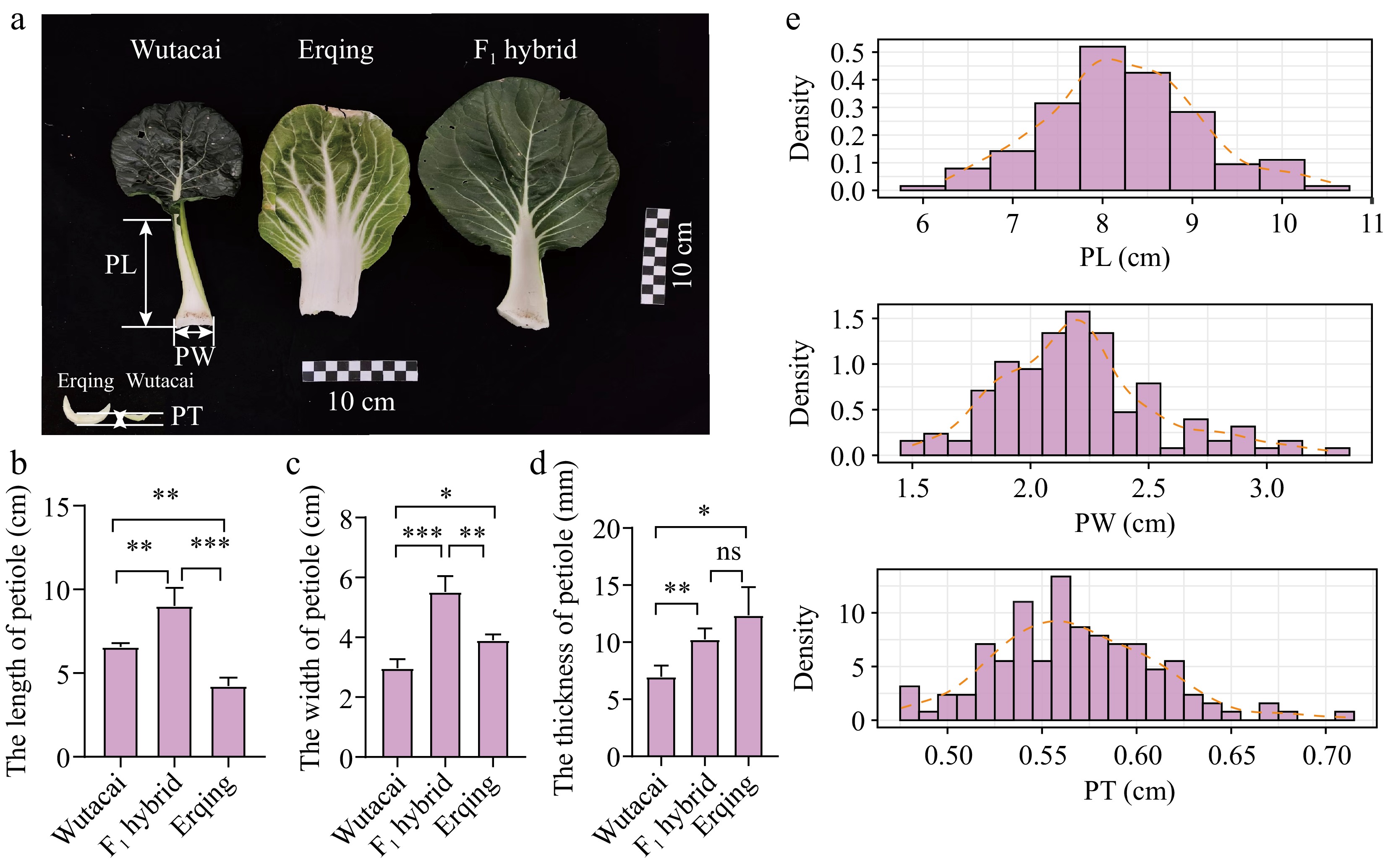 The performances of Wutacai, Erqing, F1 hybrid, and RIL population. (a) The appearance of Wutacai, Erqing, and F1 hybrid. (b) Comparison of PL from Wutacai, Erqing, and F1 hybrid. (c) Comparison of PW from Wutacai, Erqing, and F1 hybrid. (d) Comparison of PT from Wutacai, Erqing, and F1 hybrid. ns indicates no significance. Asterisks(*, **, and ***) indicate p < 0.05, p < 0.01, and p < 0.001. (e) Distribution plots of BLUPs for PL, PW, and PT.