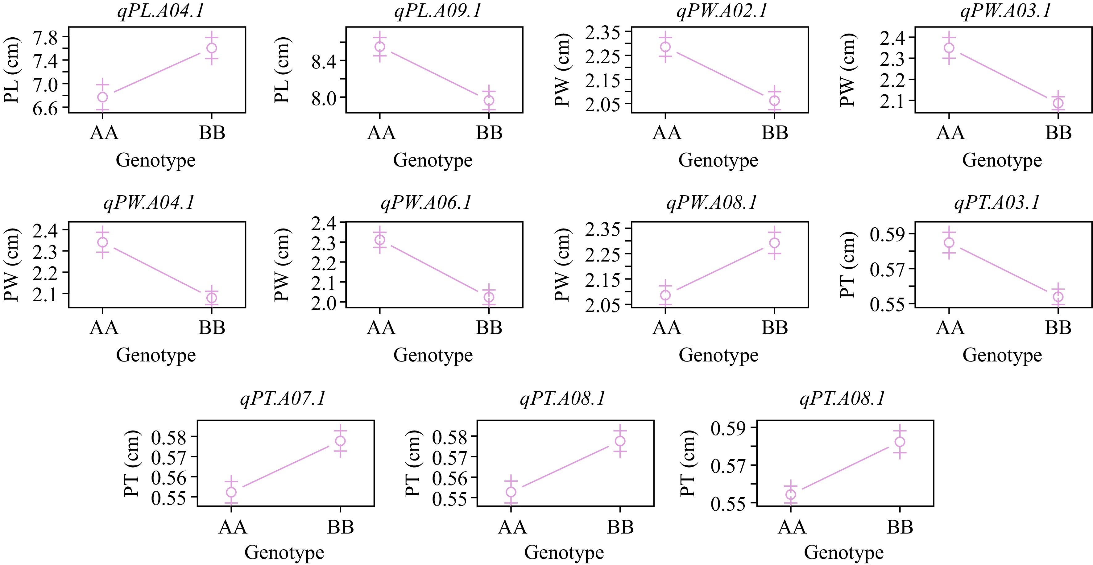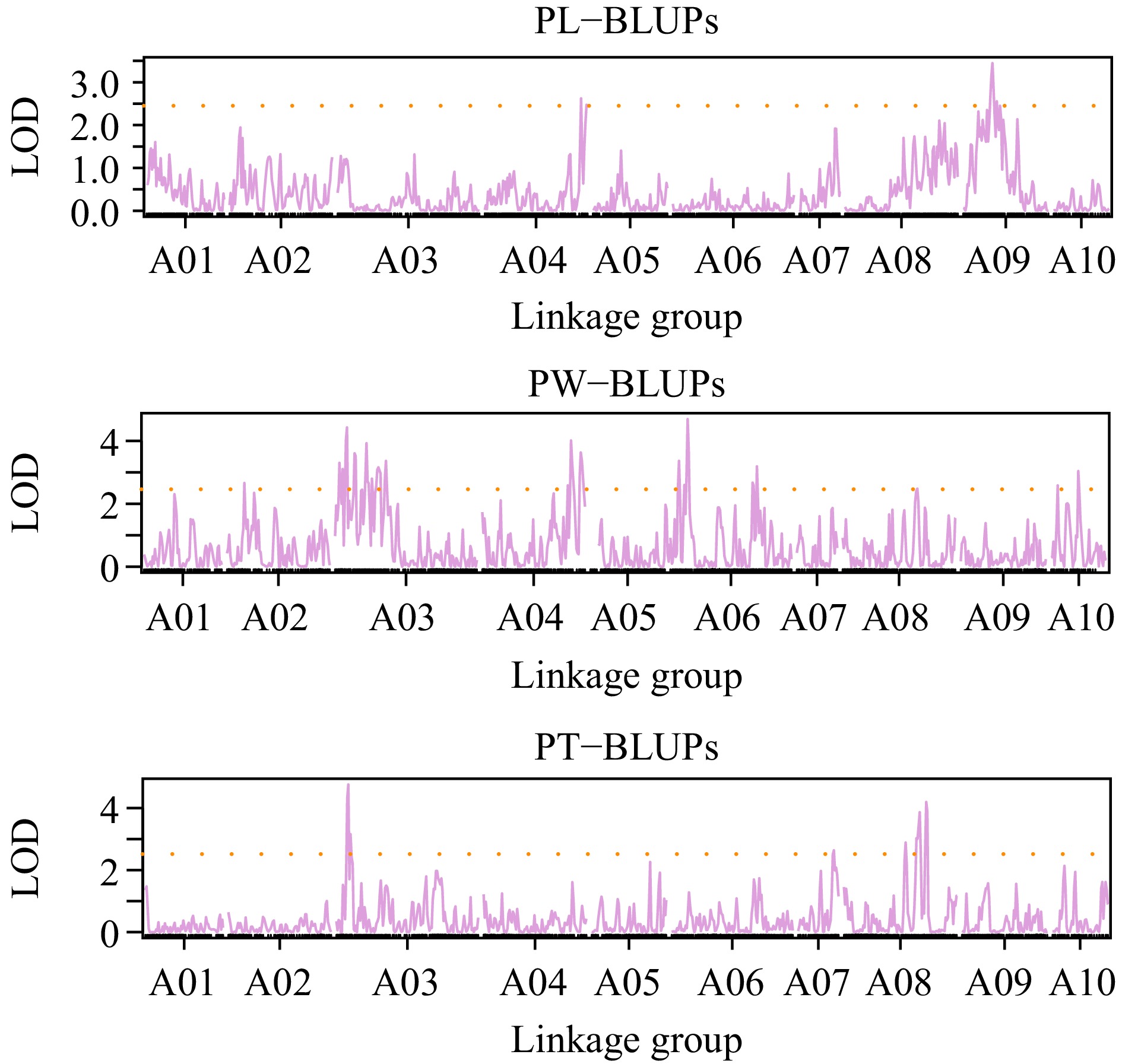 QTL mapping for BLUP values in PL, PW, and PT.