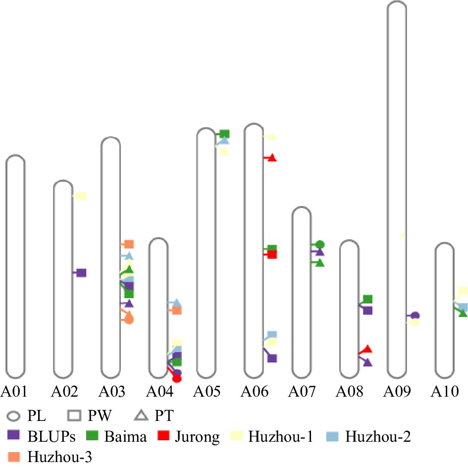 • To obtain the comprehensive QTL, BLUPs and all of the phenotypic data collected from different environments were used for QTL mapping. A total of four QTL were detected in PL and contributed to 10.31%−18.57% phenotypic variance (Figs 2, 3; Supplementary Fig. S2; Table 2; Supplementary Table S3). qPL.A04.1 and qPL.A09.1 explained the highest phenotypic variance and detected at BLUPs, Jurong, and Huzhou (Figs 2, 3; Supplementary Fig. S2; Table 2; Supplementary Table S3). qPL.A03.1 and qPL.A07.1 were also detected in Baima and Huzhou (Figs 2, 3; Supplementary Fig. S2; Table 2; Supplementary Table S3). A total of seven QTL were detected for PW and explained 15.49%−45.94% phenotypic variance (Figs 2, 3; Supplementary Fig. S2; Table 2; Supplementary Table S3). qPW.A03.1, qPW.A04.1, and qPW.A06.1 were detected in several environments and explained 2.39%−6.63%, 3.10%−5.66%, and 2.77%−15.49% phenotypic variance, respectively (Figs 2, 3; Supplementary Fig. S2; Table 2; Supplementary Table S3). A total of eight QTL were detected in PT and explained 20.76%−31.20% phenotypic variance (Figs 2, 3; Supplementary Fig. S2; Table 2). qPT.A03.1, was detected in the majority of environments, was determined as the stable QTL for PT and explained 5.89%−19.83% phenotypic variance (Figs 2, 3; Supplementary Fig. S2; Table 2; Supplementary Table S3). The QTL for PL, PW, and PT were not stable and affected easily by environments.