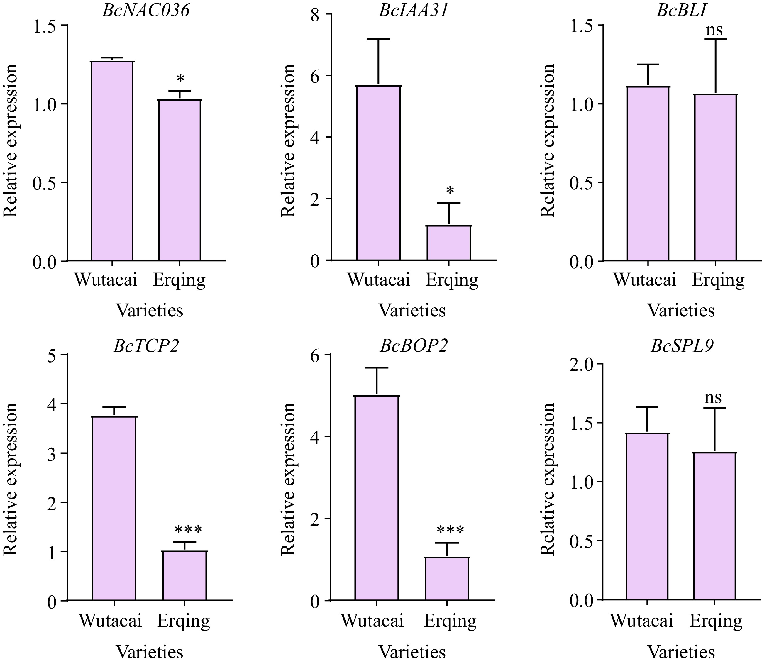 The qRT-PCR analysis was adopted to further identify the candidate genes. The expression levels of six candidate genes (BcNAC036, BcIAA31, BcBLI, BcTCP2, BcBOP2, and BcSPL9) were detected in petioles of parental lines, and others were not, suggesting the association between these genes and petiole development (Fig. 5). The expression levels of BcBLI and BcSPL9 showed no significant difference between Wutacai and Erqing, which indicated that the two genes were not related to petiole shape (Fig. 5). The expression levels of BcNAC036, BcIAA31, BcTCP2, and BcBOP2 in Wutacai were higher than that in Erqing (Fig. 5). Especially, the expression levels of BcIAA31 and BcBOP2 in Wutacai were approximately five folds of those in Erqing (Fig. 5). The results revealed that BcNAC036, BcIAA31, and BcTCP2 may be the major candidate genes in qPL.A03.1, qPW.A03.1, and qPT.A03.1, and BcIAA31 was the promise candidate genes. BcBOP2 was the promising candidate gene in qPL.A04.1, qPW.A04.1, and qPT.A04.1.