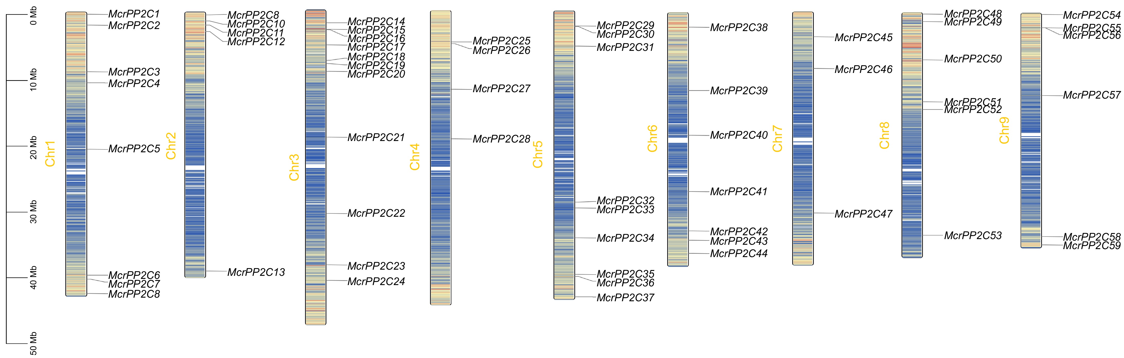 Chromosome distribution of the PP2C gene family in M. crystallinum. McrPP2Cs are marked on nine chromosomes and the chromosome length is demonstrated in the left scale. Different chromosomal colors indicate different gene densities, with red representing the highest density and blue representing the lowest density.