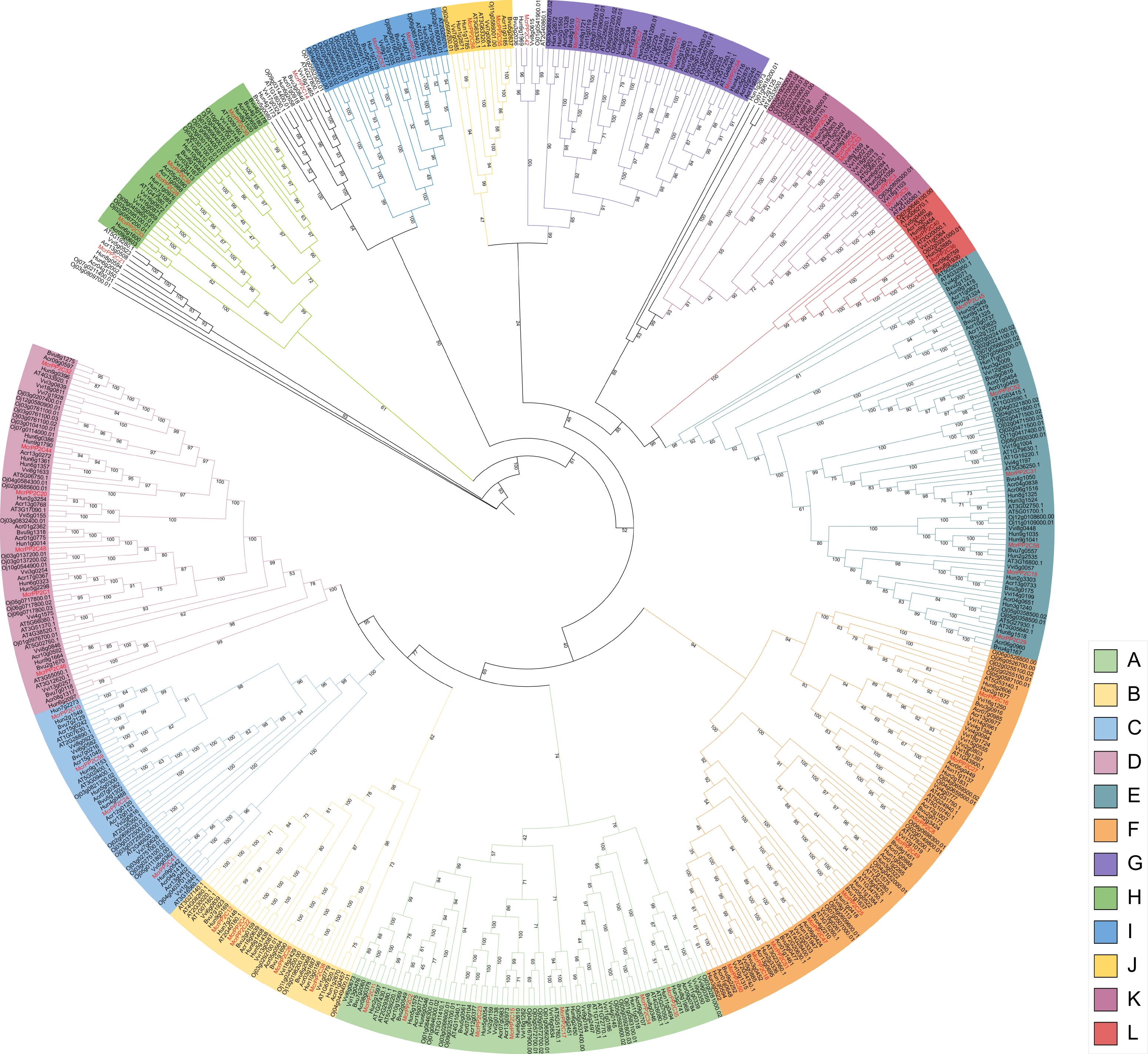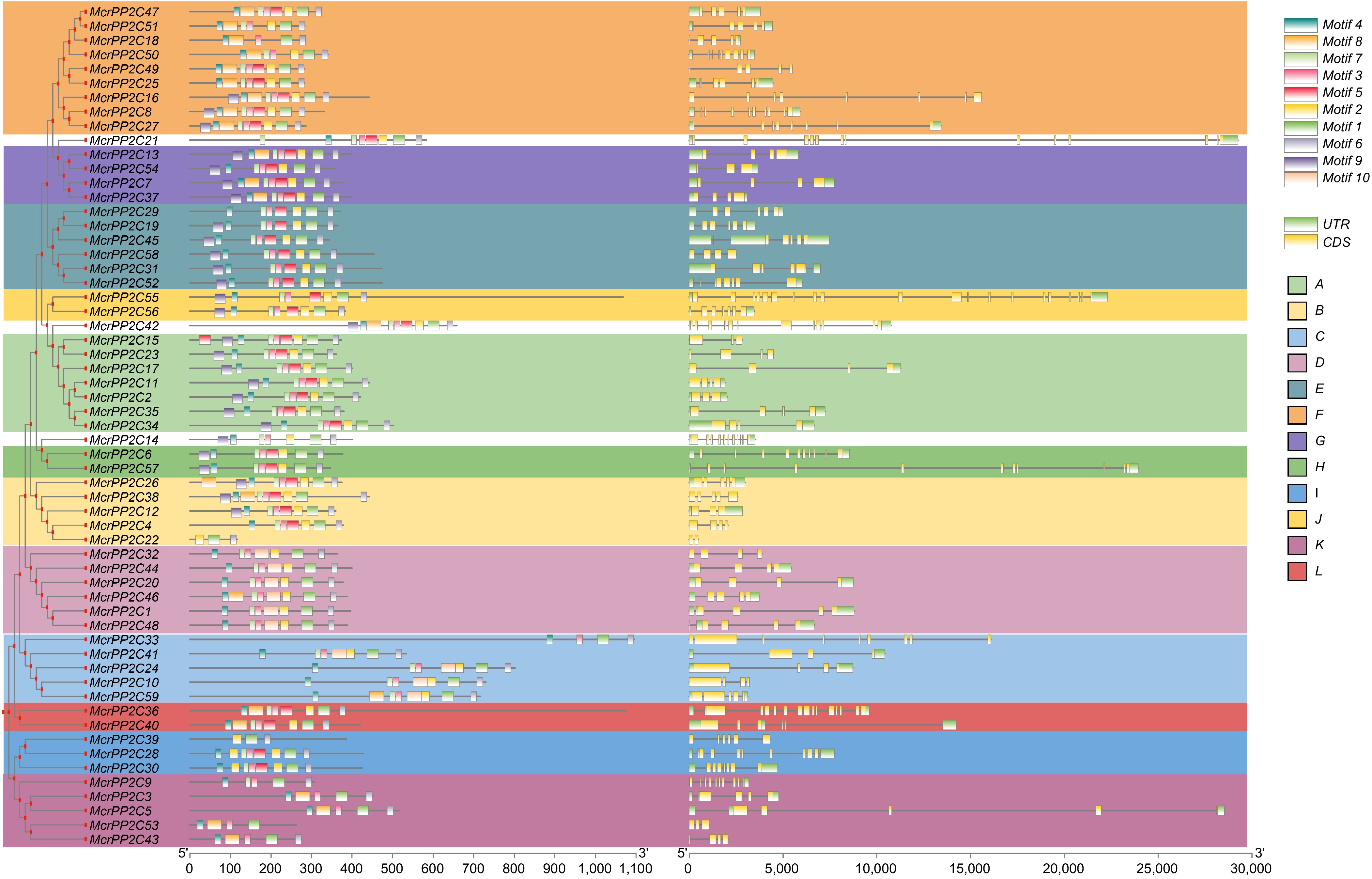 • To clarify the evolutionary relationships of PP2Cs, the protein sequences of PP2Cs from the seven studied species were combined to construct a phylogenetic tree. According to the topological structure, 56 McrPP2Cs were divided into 12 clades (A−L), and three McrPP2Cs not assigned to any clade (Fig. 2, Table 1). Clade F had the largest number (9), followed by clade A (7). For the PP2Cs of the other six studied species, the clades E or F were the largest in most cases. The only exception was O. sativa, in which clade D had the largest number (Fig. 2, Table 1). Each clade contained PP2Cs from all seven species and genes from the same species tended to cluster together (Fig. 2, Table 1).
