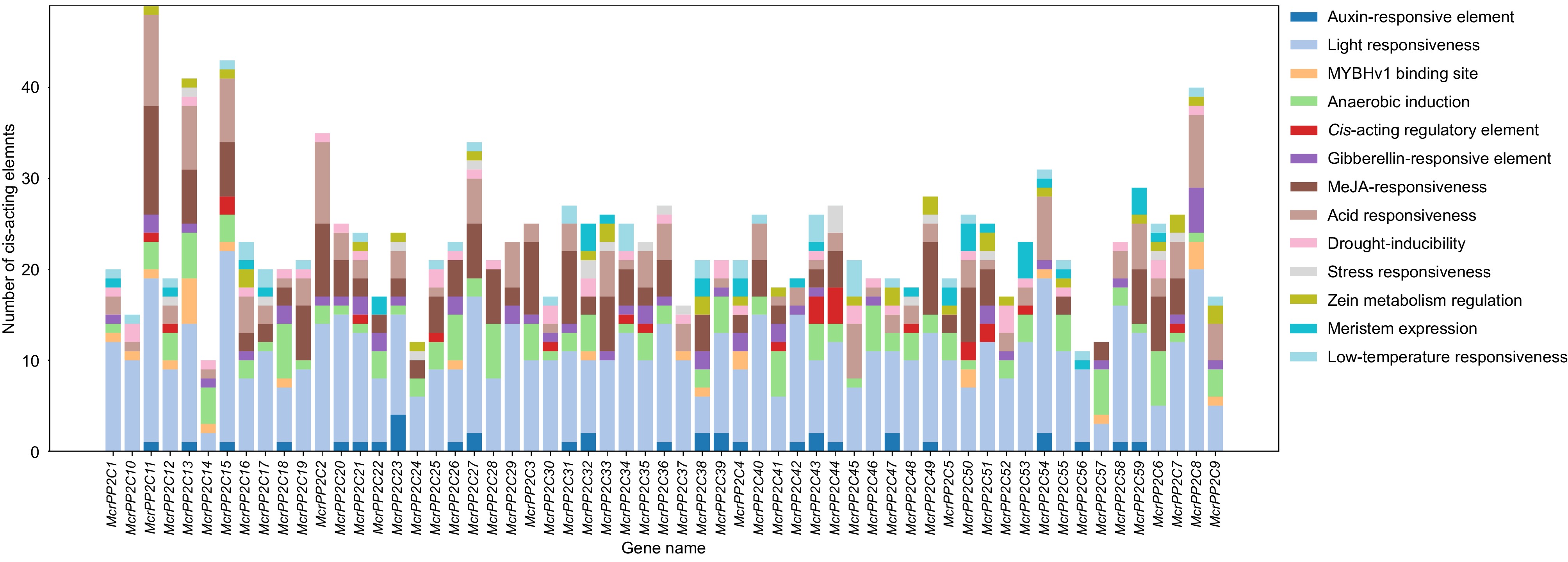 Cis-elements analysis of PP2C genes in M. crystallinum. Different colors indicate different components. The vertical bar indicate the number of elements.