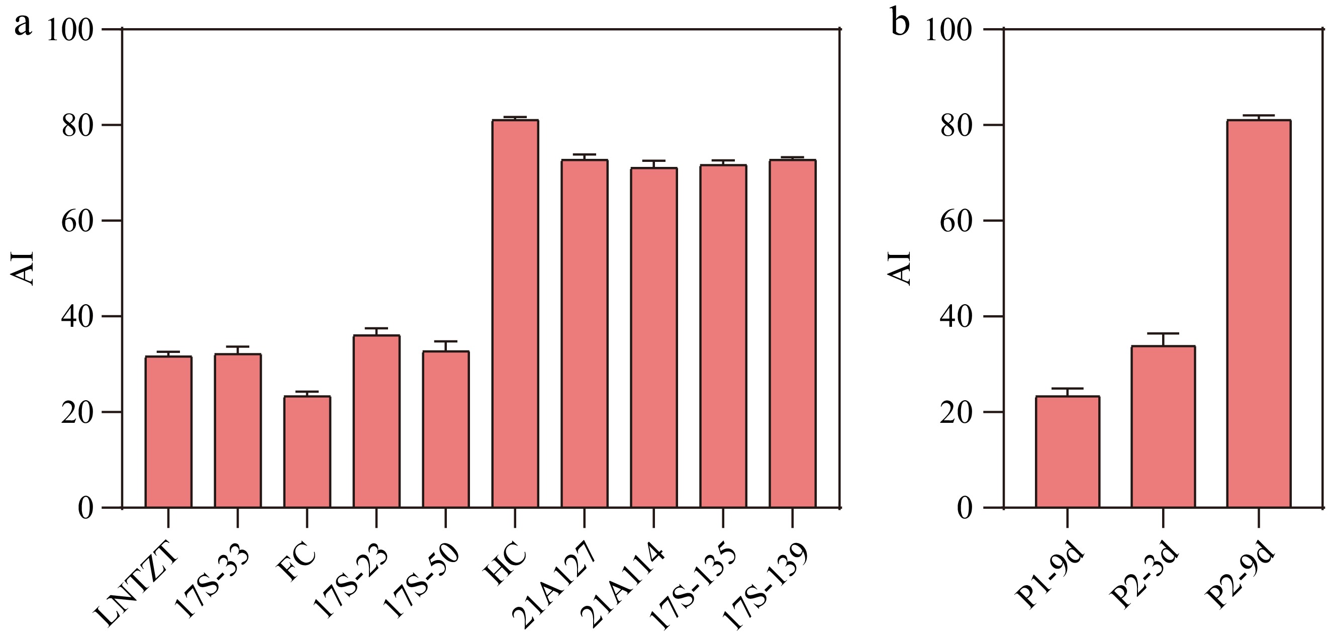 (a) Evaluation of astringency levels for different cucumber fruits. (b) Evaluation of astringency levels for P1-9d, P2-3d, and P2-9d. AI: Astringency Index. Data are presented as the mean ± SD of three biological replicates.
