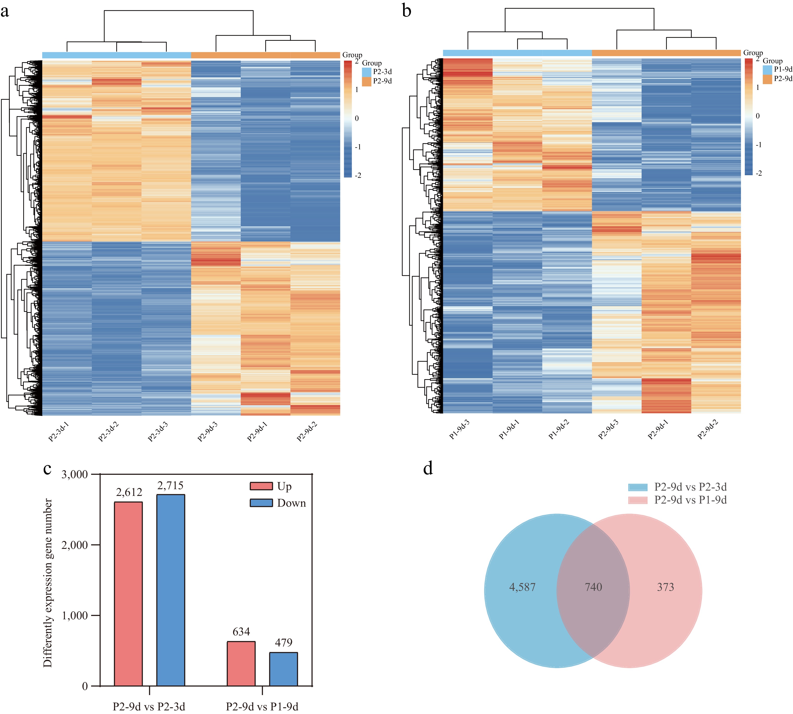 Transcriptome analysis of cucumber fruits with different astringency levels. (a), (b) Clustered map of DEGs. (c) The number of upregulated and downregulated DEGs in P2-9d vs P2-3d, and P2-9d vs P1-9d comparisons. (d) Venn diagram showing common DEGs in P2-9d vs P2-3d, and P2-9d vs P1-9d comparisons.