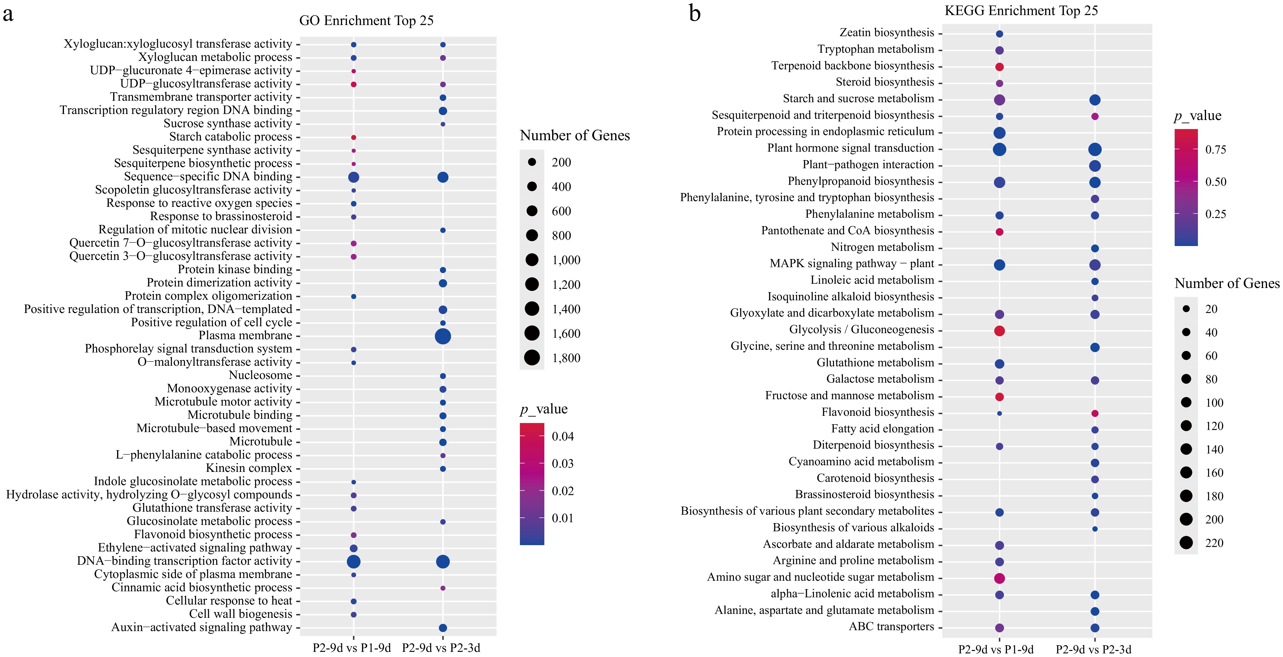 (a) GO, and (b) KEGG enrichment analyses of DEGs in P2-9d vs P1-9d, and P2-9d vs P2-3d comparisons.