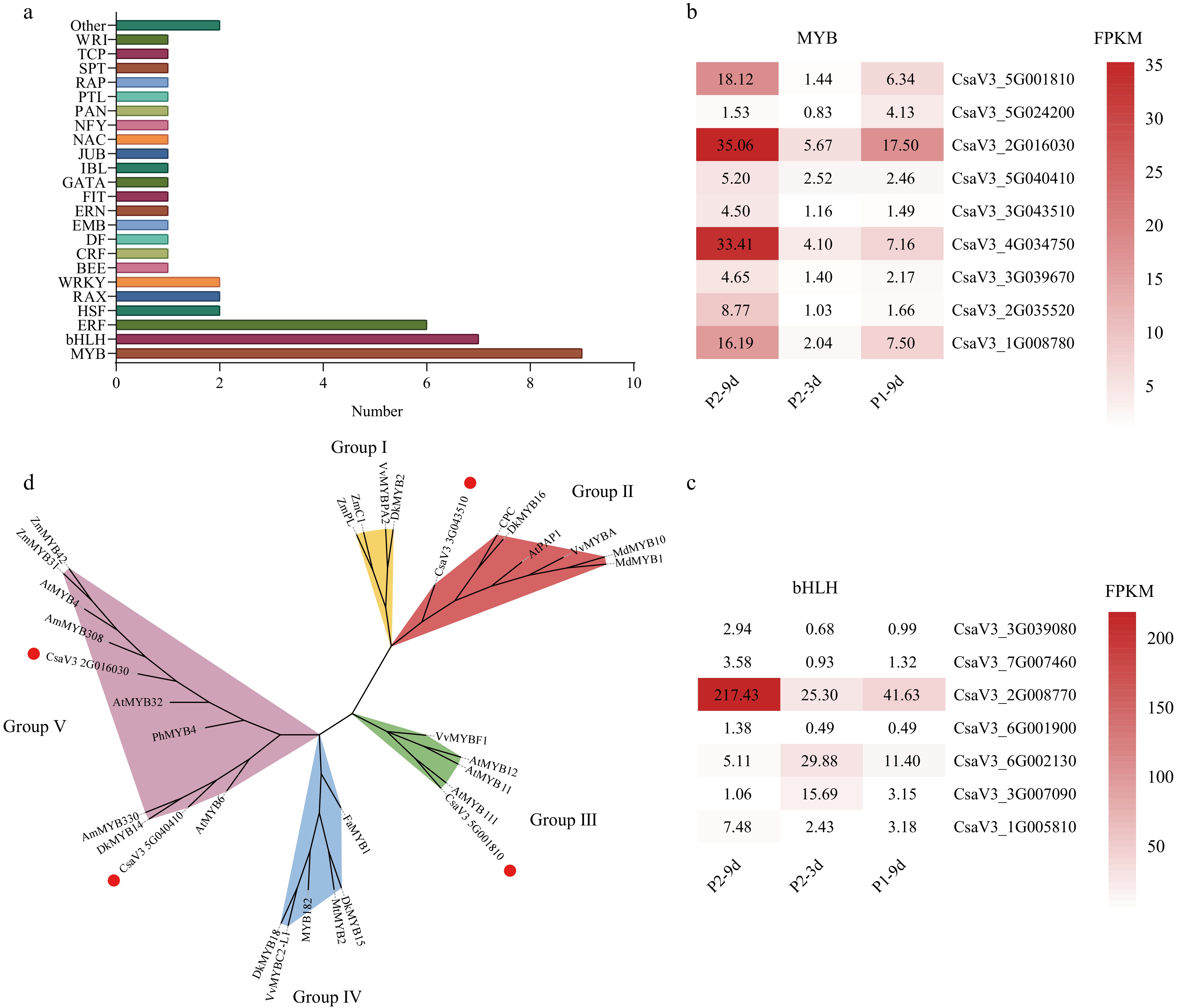 Differentially expressed transcription factors (TFs) common to both comparisons. (a) Distribution of TF families. Gene expression levels indicated by color bars, showing expression trends of (b) MYB family TFs, and (c) bHLH family TFs. (d) A maximum likelihood phylogenetic tree was inferred for cucumber CsMYBs and orthologous flavonoid biosynthesis regulators from other plant species, incorporating 1,000 bootstrap replicates. Solid red dots represent MYBs isolated in our study; Groups I, II, III, IV, and V indicate proanthocyanidin activators, anthocyanidin, flavonol activators, flavonoid repressors, and phenylpropanoid repressors, respectively. All protein sequence accession numbers from GenBank are tabulated in Supplementary Table S5.
