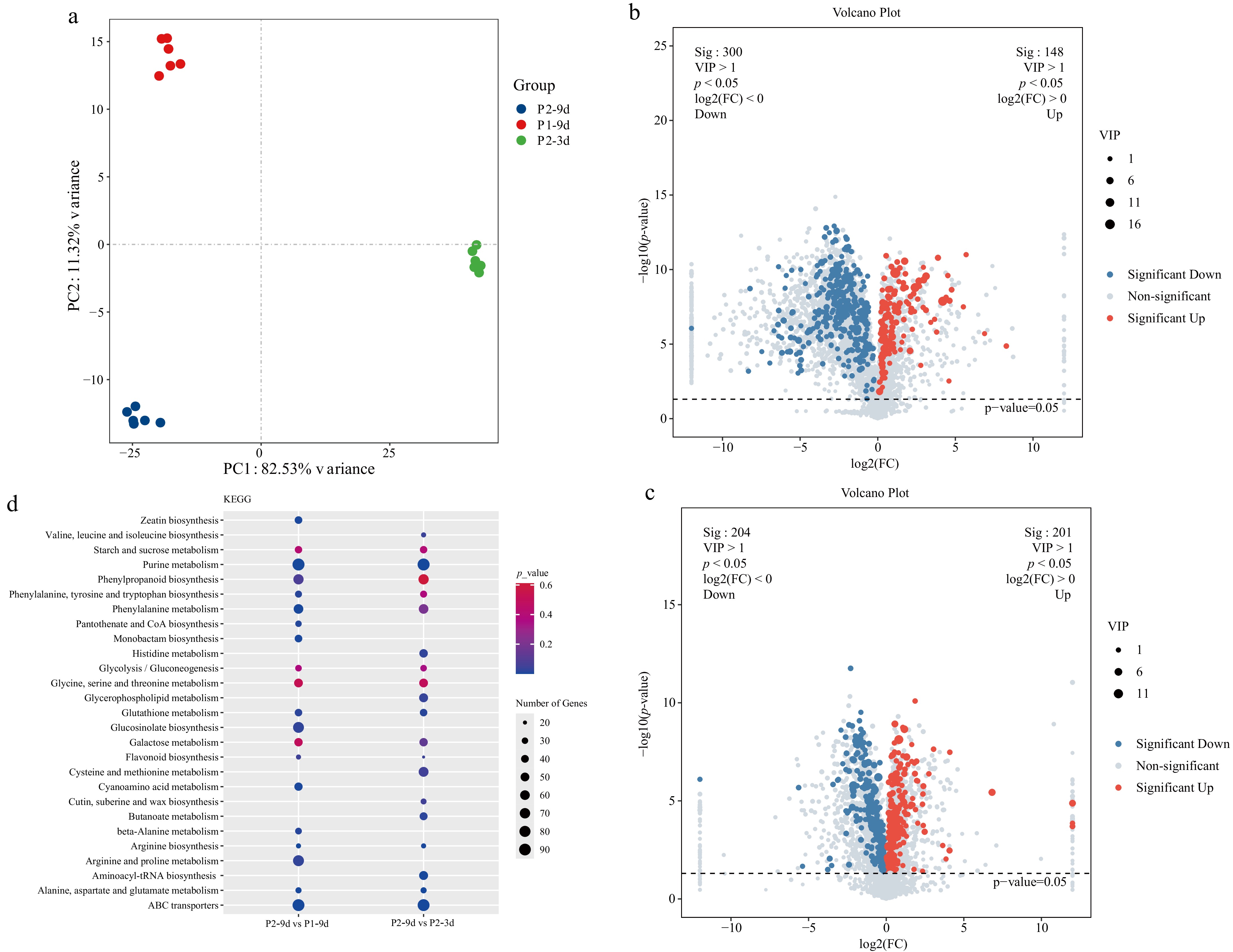 Metabolomics analysis of different astringency cucumber. (a) PCA score scatter plots of metabolites, with different colors representing different sample groups. (b) Volcano plots of the DAMs for P2-9d vs P1-9d. (c) Volcano plots of the DAMs for P2-9d vs P2-3d. (d) Top 20 KEGG enrichment terms for P2-9d vs P1-9d, and P2-9d vs P2-3d comparisons; dot size in the plot indicates the number of DEGs.
