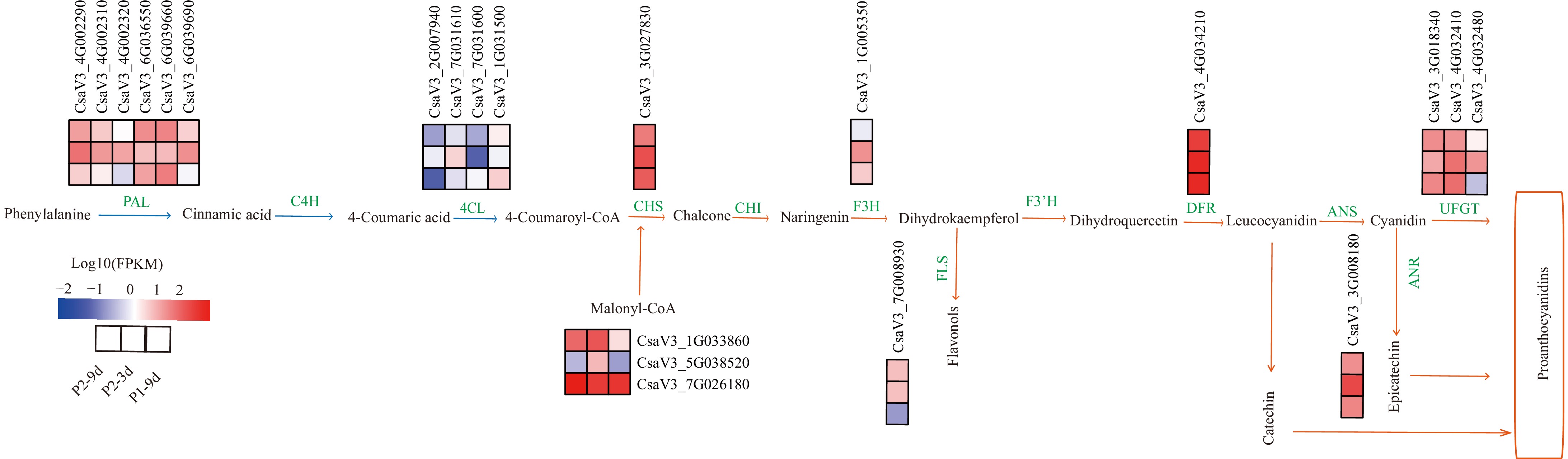 Here, the transcriptome and metabolome data of P1-9d, P2-3d, and P2-9d were analyzed. Combined transcriptomic and metabolomic analysis revealed the molecular mechanisms underlying cucumber fruit astringency as well as the candidate genes and metabolic pathways. CsPAL (CsaV3_4G002290, CsaV3_4G002320), Cs4CL (CsaV3_2G007940, CsaV3_1G031500), CsUFGT (CsaV3_3G018340, CsaV3_4G032410), CsMYB (CsaV3_5G040410, CsaV3_5G001810), and CsbHLH (CsaV3_2G008770, CsaV3_6G001900) were identified as the key genes related to astringency of cucumber fruits. These findings provide a theoretical foundation for improving cucumber astringency and serve as a reference for studying secondary metabolites in other plants. Future work could experimentally validate gene functions of the candidate genes, dissect regulatory pathways, and leverage multi-omics technologies to improve the understanding of plant secondary metabolites.
