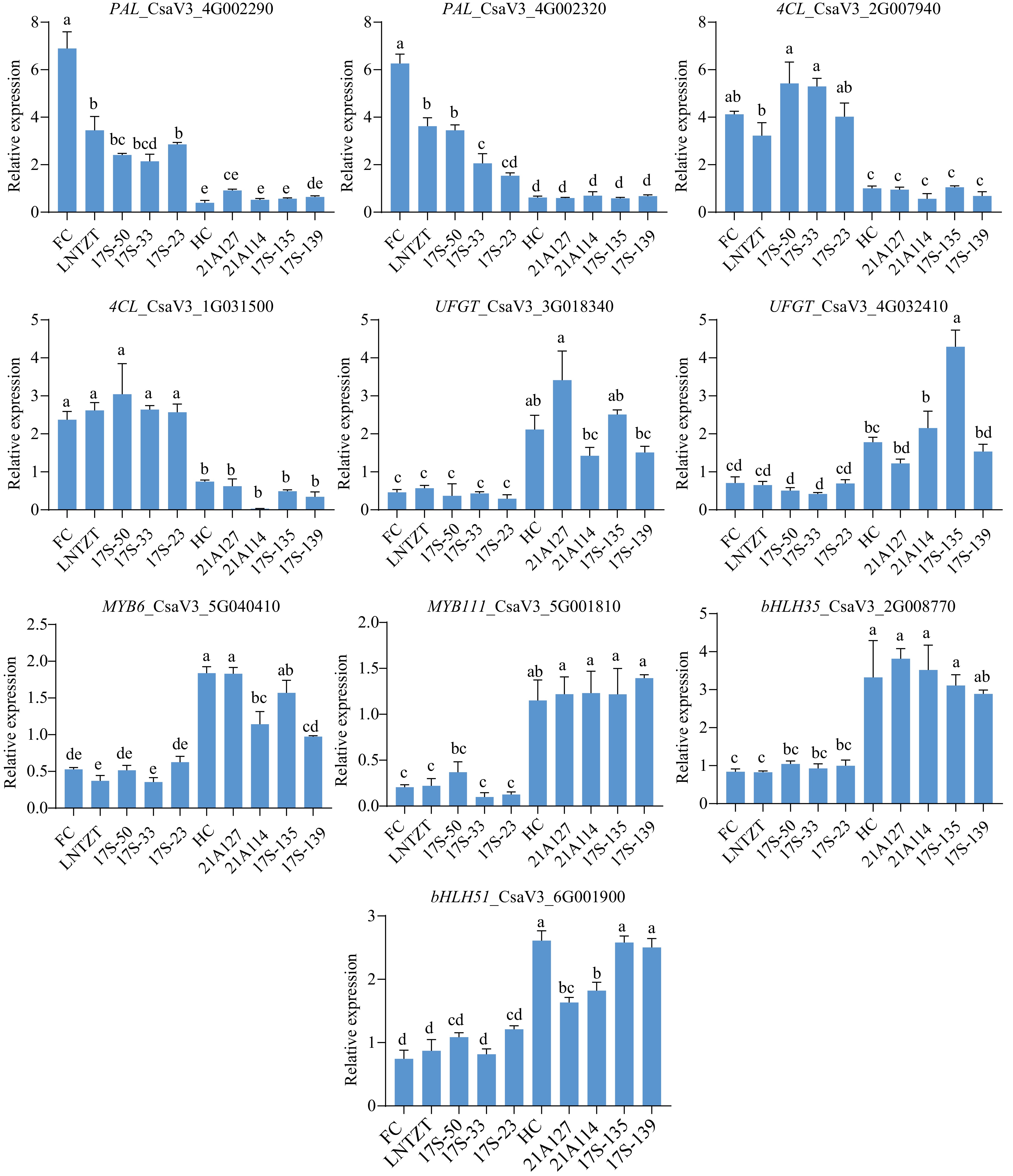 Verifying whether the 21 candidate genes and TFs participated in the formation of astringent substances in cucumbers, their expression levels were quantified across different astringency resources (Fig. 1a). Notably, CsPAL (CsaV3_4G002290, CsaV3_4G002320) and Cs4CL (CsaV3_2G007940, CsaV3_1G031500) exhibited higher expression in fruits with slight astringency than in those with strong astringency, indicating their potential negative regulatory role in cucumber fruit astringency. Conversely, CsUFGT (CsaV3_3G018340, CsaV3_4G032410), CsMYB6 (CsaV3_5G040410), CsMYB111 (CsaV3_5G001810), CsbHLH35 (CsaV3_2G008770), and CsbHLH51 (CsaV3_6G001900) exhibited relatively high expressions in fruits with strong astringency, suggesting their positive regulatory role in cucumber fruit astringency (Fig. 8; Supplementary Fig. S4).