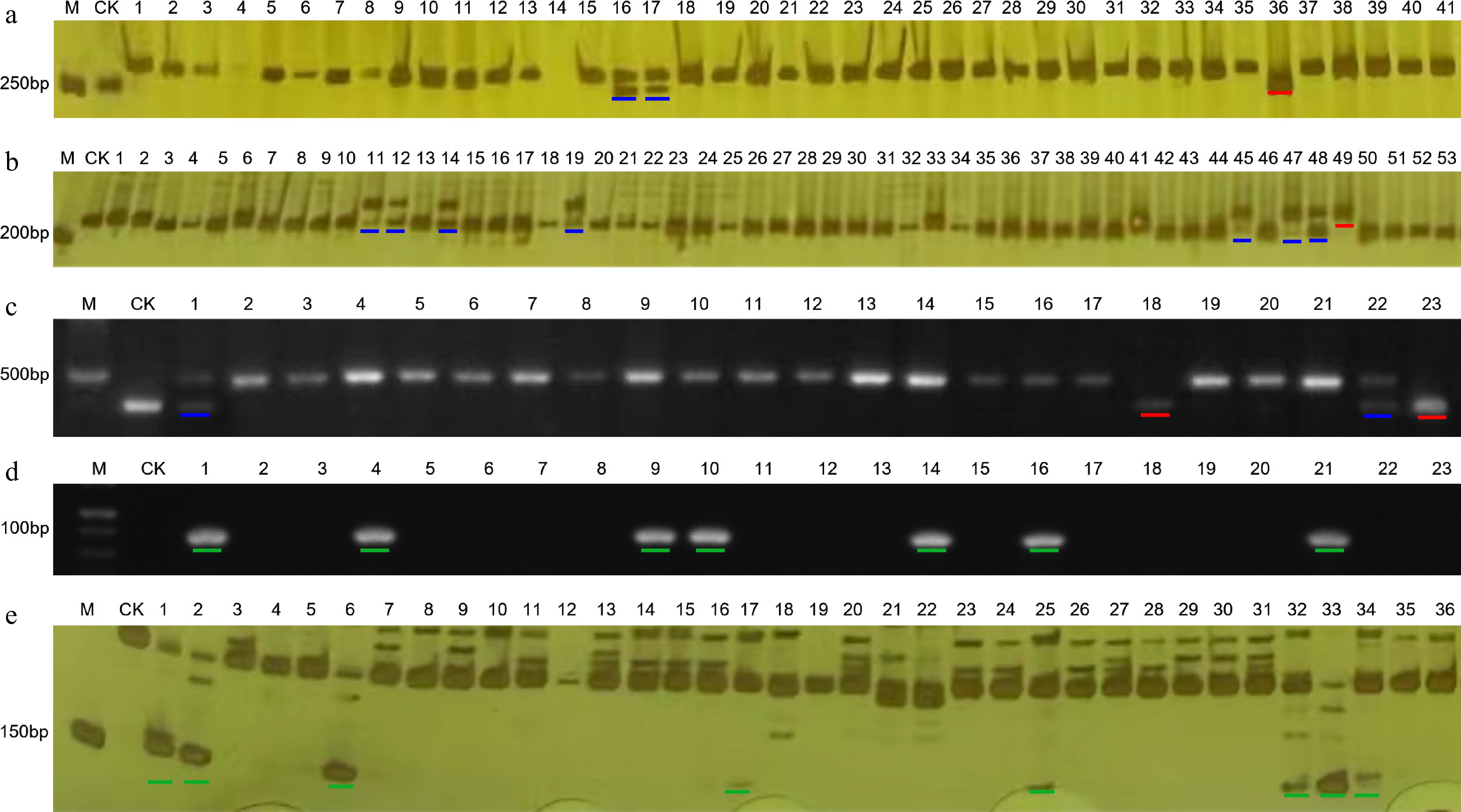 The genotyping results of some germplasms obtained by molecular markers. (a) Marker PMFR11283. (b) InDel-2-134 marker. (c) Marker PVY-CAPS. (d) Marker L4-SCAR. (e) Marker Chr-lcv-7. M: DNA marker; CK: negative control. The red line indicates a homozygous genotype for resistance to disease, while the blue line indicates a heterozygous genotype for resistance to disease. The green lines represent the disease-resistant genotypes indicated by dominant markers.