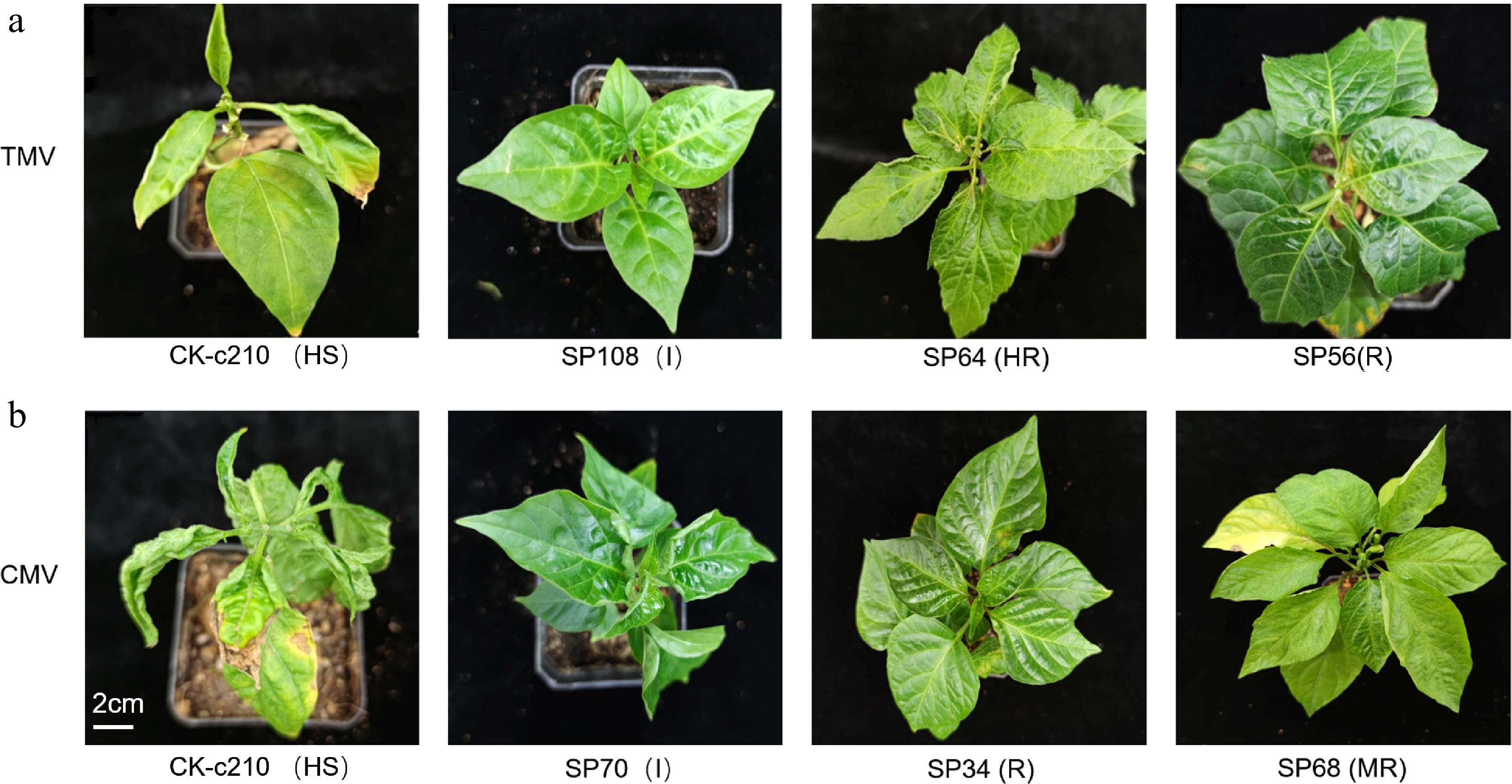 Artificial inoculation of germplasm accessions resistant to TMV and CMV in peppers. (a) Phenotypes of plants inoculated with TMV for 25 d. (b) Phenotypes of plants inoculated with CMV for 25 d.