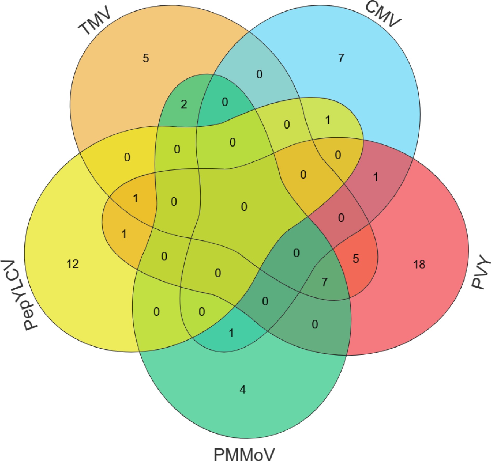 This study found that there was a high prevalence of mixed viral infections in the samples. For example, samples LZ-4, JH-2, TS-1, and HL-1 were infected with two viruses, LZ-1 and JH-4 with three, LZ-7 and JH-1 with four, and LZ-3, LZ-5, and LZ-6 with five. Mixed viral infections pose significant risks to the growth and development, yield, and quality of pepper, with the severity of effects varying depending on the specific viral combinations. These interactions can be categorized into synergistic or antagonistic types[39]. Synergistic interactions, such as helper dependence—where one virus facilitates the replication or transmission of another, lead to exacerbating the severity of the disease. In contrast, antagonistic interactions occur when one virus suppresses the fitness of another[40,41]. Notably, synergistic effects predominated in most cases, amplifying disease trends. Previous studies demonstrated that mixed infections involving CMV, PVY, and TMV significantly reduced biomass and production in pepper, with the combination of CMV + TMV causing the most severe losses (44% biomass reduction, 52% yield decline)[42]. Similarly, Kim et al. reported that simultaneous coinfection with CMV, PMMoV, and PepMoV induced more pronounced CMV-induced symptoms compared to single infections, highlighting the role of synergistic interactions in intensifying pathological outcomes[43].