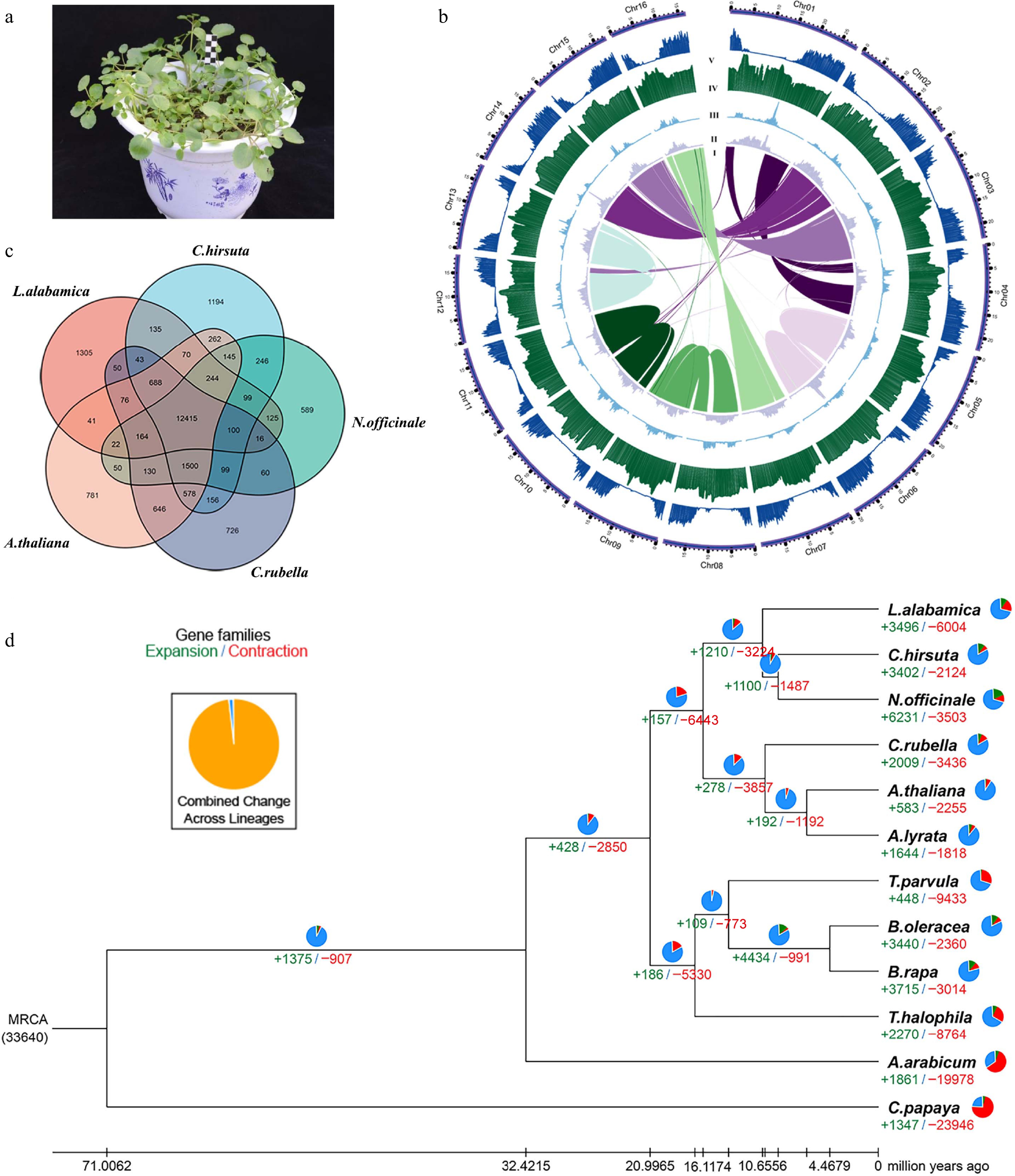 Plant morphology, genome assembly, and genome features of watercress. (a) the watercress cultivar used in this study. (b) The landscape of the watercress genome: syntenic blocks (I), copia density (II), gyspy density (III), GC content (IV), and gene density (V). (c) Venn diagram representing the shared and unique gene families among watercress, A. thaliana, C. hirsuta, C. rubella, L. alabamica, and N. officinale. (d) Phylogenetic tree showing the divergence time and the evolution of gene family size for 12 species including watercress. The numbers at the branches represent gained (green) and lost (red) gene families. The small pie charts represent the percentage of expanded (green), contracted (red), and unchanged (blue) gene families.