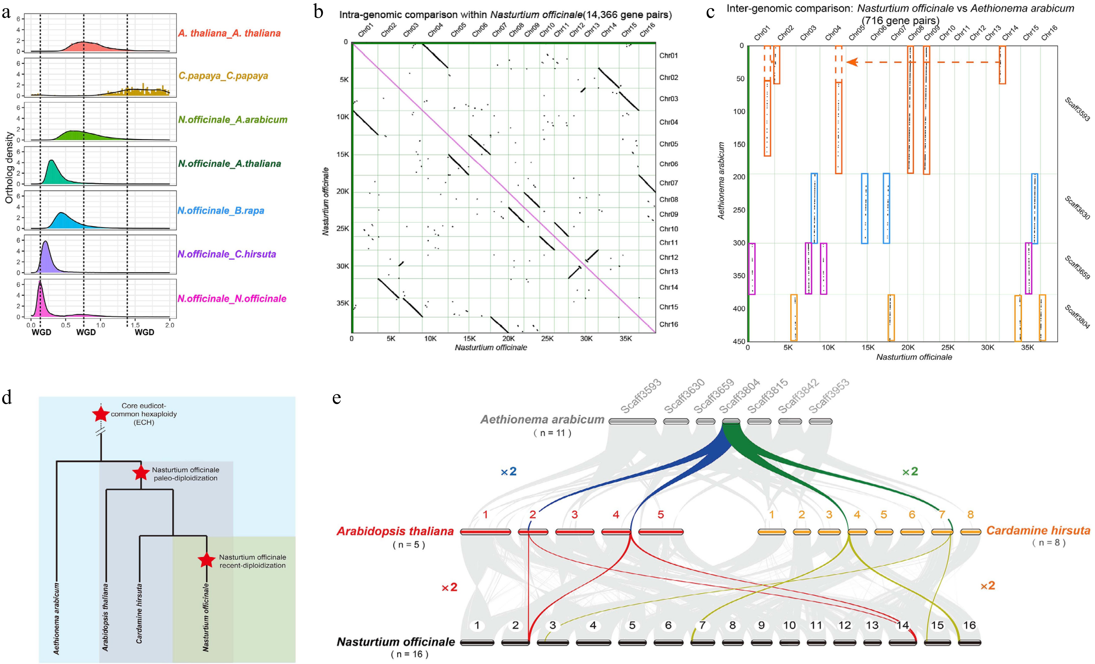 Whole-genome duplication in the watercress genome. (a) The density distribution of Ks for paralogs and orthologs within and between species. (b) Dot plot of syntenic genes within the watercress genome. (c) Dot plot of syntenic genes between the genomes of A. arabicum and watercress. (d) Model of species divergence. (e) Model of species WGD.