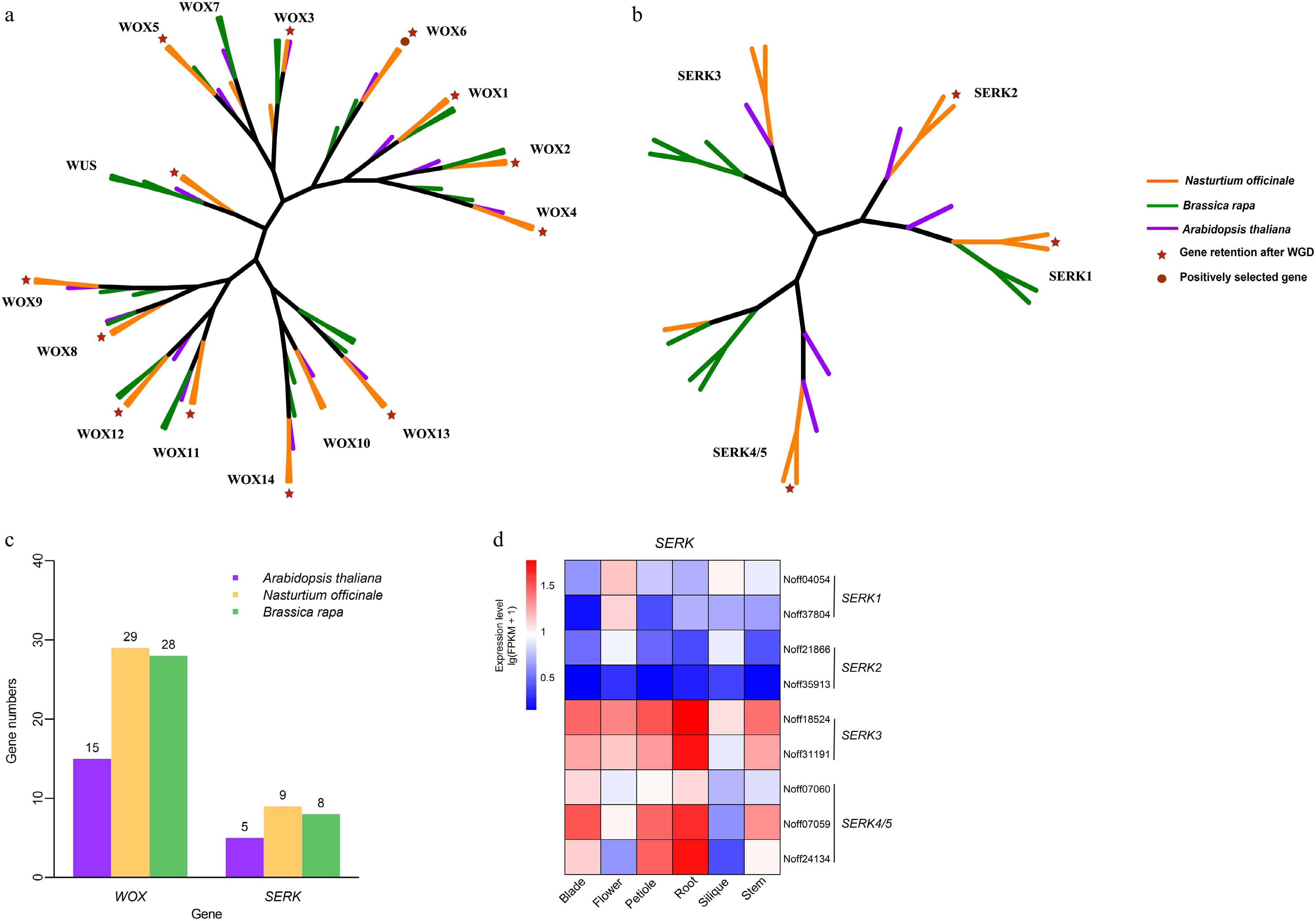 • Strong regenerative ability is one of the mechanisms of plants' adaptation to aquatic environments. The regeneration-related genes mainly include the WOX and SERK gene families, LEC2, and BBM[41]. We identified 29 WOX and 9 SERK genes in watercress, while 28 WOX and 8 SERK genes were found in Brassica rapa (Fig. 3ac; Supplementary Tables S14 & S15). Brassica rapa has fewer WOX and SERK genes than watercress. We did not identify SERK2 in Brassica rapa. Watercress retained 26 WOX and 6 SERK genes after WGD, accounting for 89.66% and 66.67% of each gene family, respectively. Furthermore, WOX6 was identified as a positively selected effect gene and was retained after WGD. Watercress RNA-seq data showed high expression of most SERK genes (Fig. 3d; Supplementary Table S16), and these might play an important role in the regeneration of watercress.