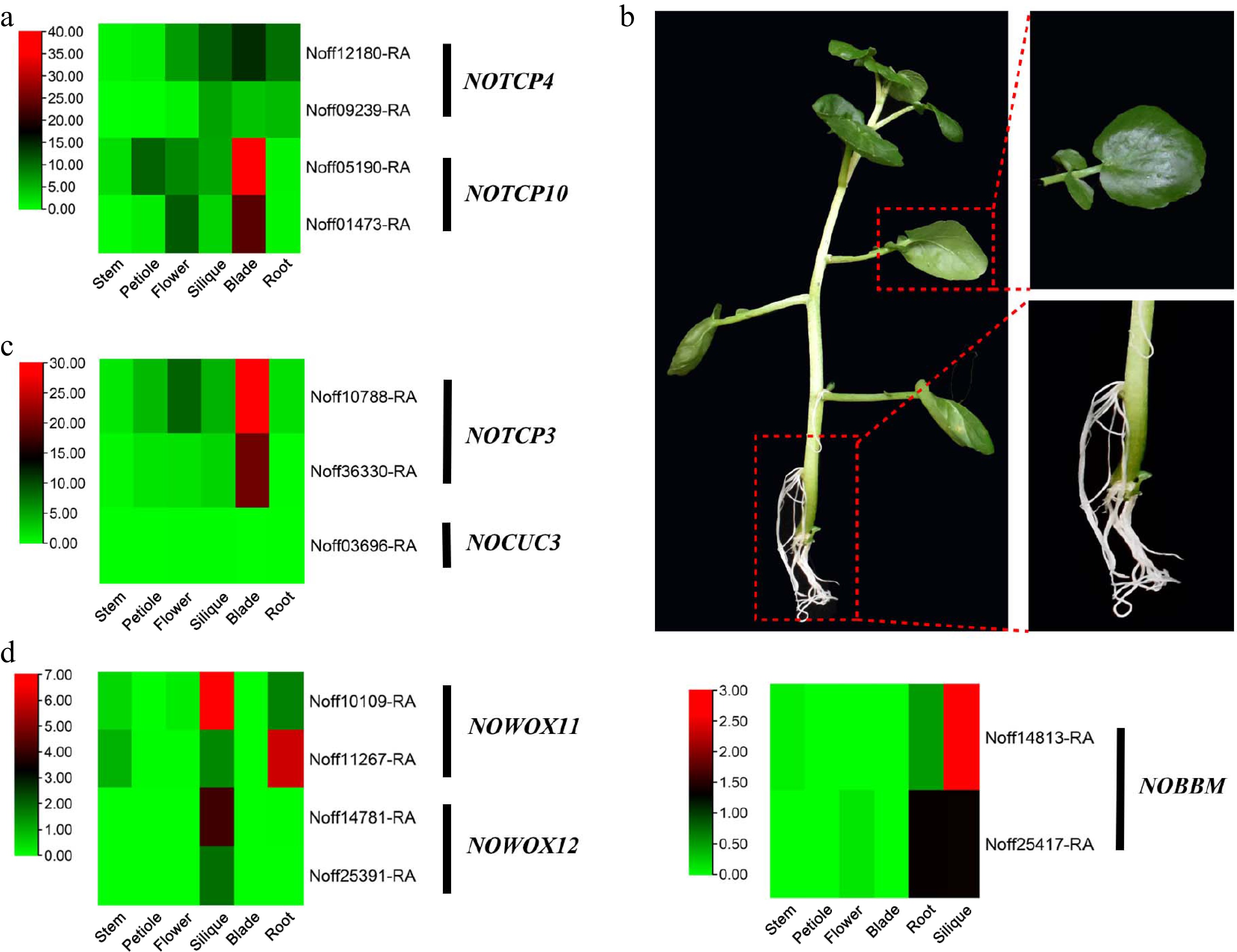 Evolution of genes involved in leaf and root morphogenesis in the watercress genome. (a) Heatmap of the expression levels of NoTCP4 and NoTCP10 in different organs. (b) Leaves and aerial adventitious roots of watercress. (c) Heatmap of the expression levels of NoTCP3 and NoCUC3 in different organs. (d) Heatmap of the expression levels of NoBBM, NoWOX11, and NoWOX12 in different organs.