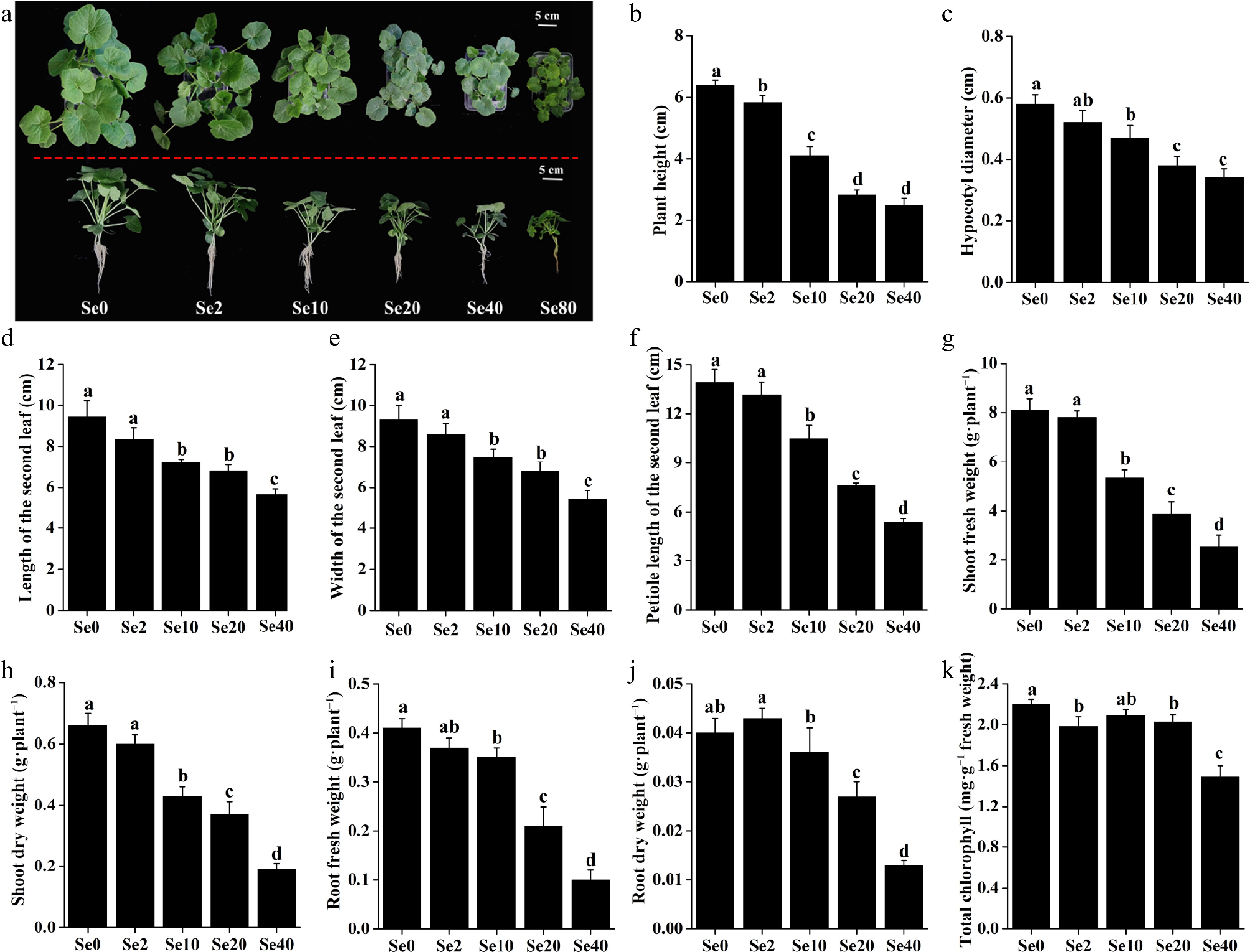 Se2 and Se20 treatments significantly reduced the content of total chlorophyll in WCO39 seedling leaves by 10% and 7.72%, respectively, compared to the control (Fig. 2k). It is worth noting that Se40 treatment decreased plant height by 61.41%, hypocotyl diameter by 41.38%, leaf length by 40.30%, leaf width by 42.12%, Petiole length by 61.37%, shoot fresh weight by 68.73%, shoot dry weight by 71.21%, root fresh weight by 75.61%, root dry weight by 67.50%, and total chlorophyll content by 32.27%, compared to Se0 treatment (Fig. 2), indicating the serious inhibition of plant growth under Se40 treatment. Moreover, the results showed that plants treated with 80 μM selenite (Se80) exhibited more pronounced symptoms of growth suppression, leaf chlorosis, and root necrosis (Fig. 2a). These results demonstrated the serious toxicity of high selenite concentrations to C. moschata.