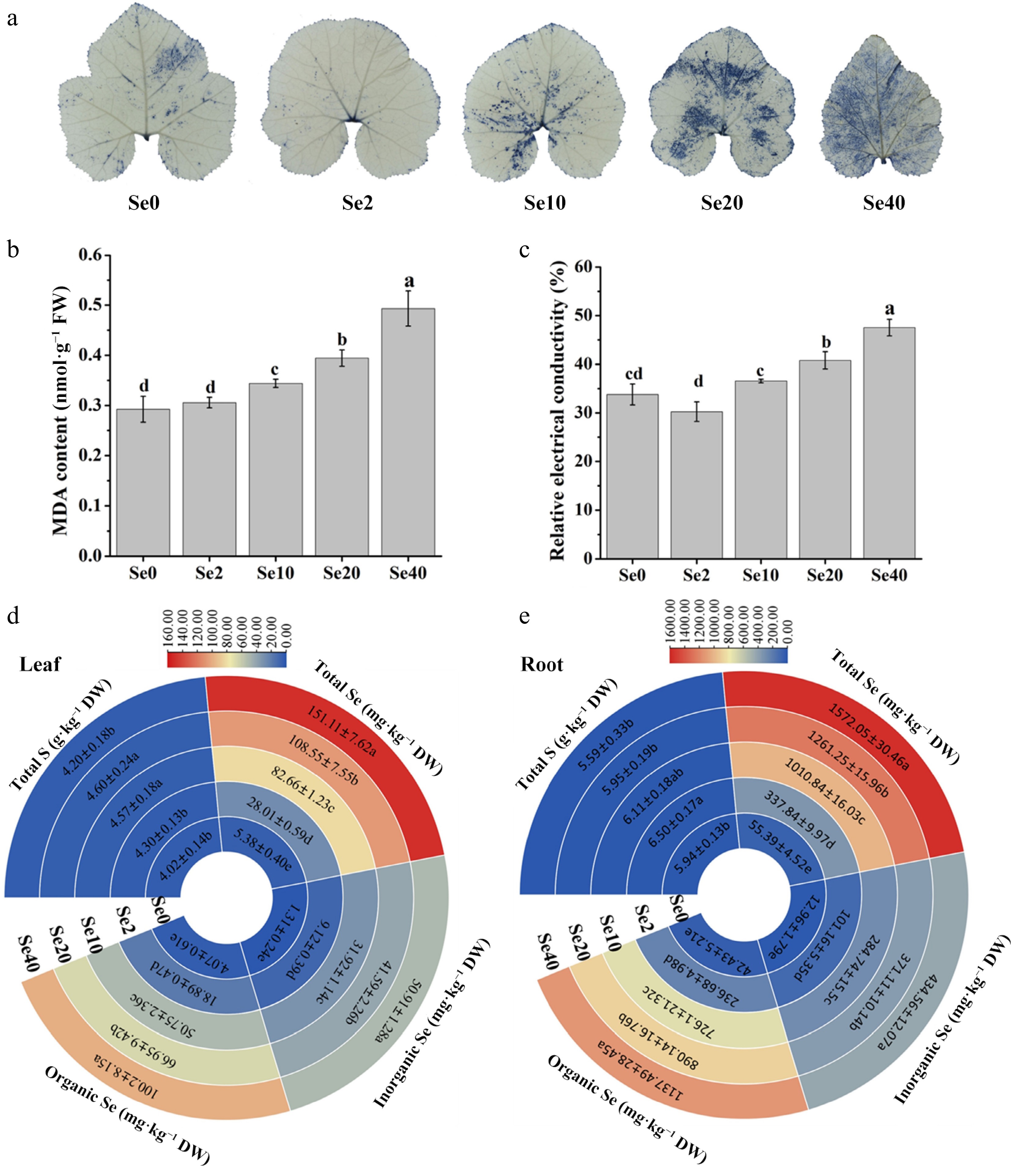 Influence of selenite on various physiological parameters in WCO39 seedlings. (a) Accumulation of O2·− in leaves visualized by NBT staining. (b) MDA content. (c) Relative electrical conductivity. (d), (e) Heatmaps showing the content of total S, Se, inorganic Se, and organic Se in leaves and roots, respectively. Se0, Se2, Se10, Se20, Se40, and Se80 represent 0, 2, 10, 20, 40, and 80 μM selenite treatment, respectively. The data are shown as mean ± SD (n = 3). Different small letters on the bars and heatmaps stand for significant differences at p < 0.05 according to Duncan's multiple scope tests.