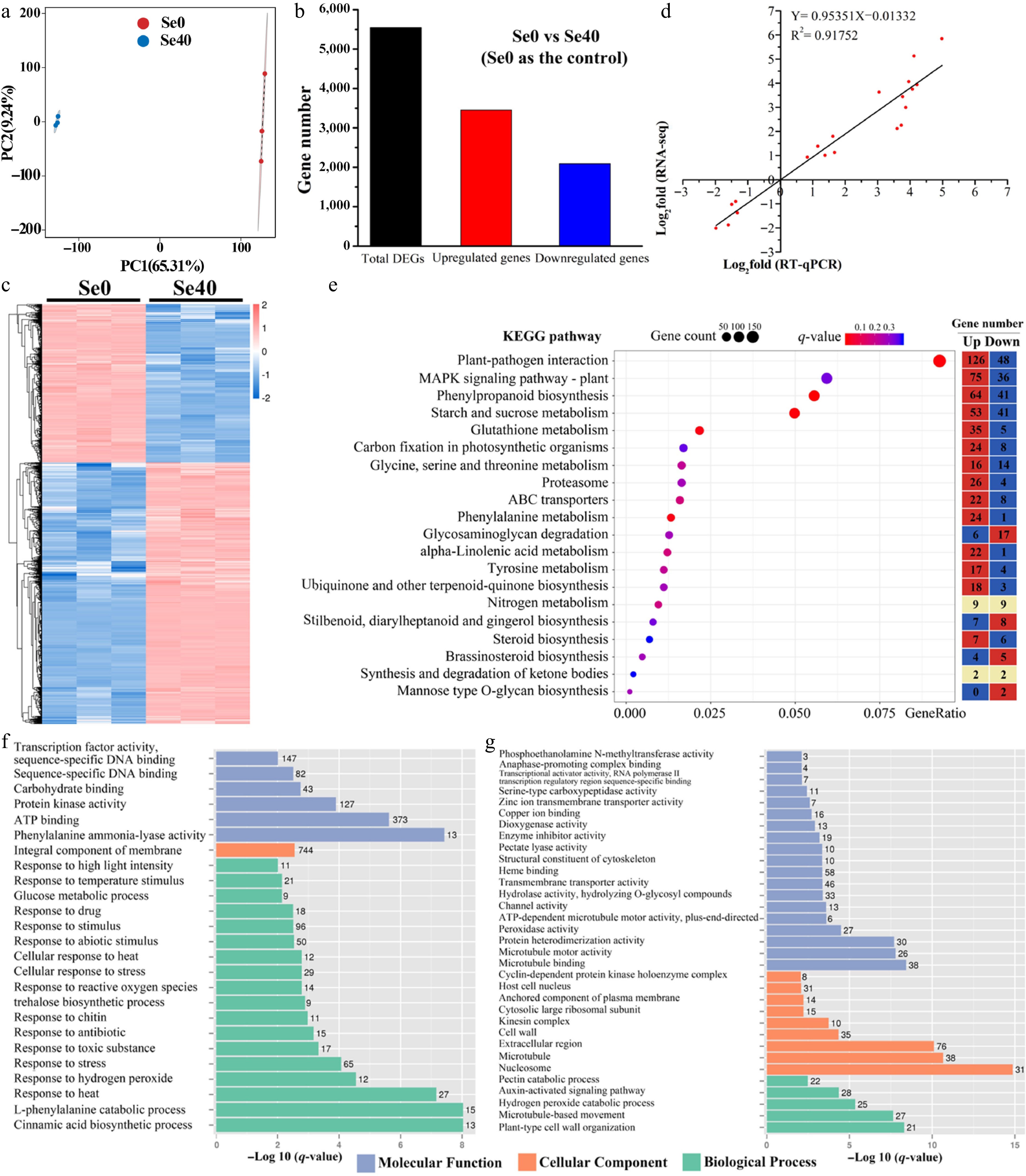 Analysis of differentially expressed genes (DEGs) identified in Se0 vs Se40 comparison. (a) Principal component analysis (PCA) analysis. (b) Number of DEGs in Se0 vs Se40. (c) Heatmap showing the hierarchical clustering of DEGs. Both the rows and the columns are scaled by normalization. (d) Correlation analysis between the RNA-seq and qRT-PCR results. The abscissa (X-Ais) and ordinate (Y-Ais) quantitatively represent the Log2-transformed fold-change values (Se40/Se0) derived from RNA-seq and qRT-PCR analyses, respectively. (e) KEGG pathway enrichment analysis of DEGs. The topmost enriched 20 KEGG pathways with the lowest q-values are shown. Gene ratio refers to the ratio of the DEGs to the total number of annotated genes in each pathway. The heatmap on the right side shows the number of upregulated and downregulated genes in each KEGG pathway. (f), (g) GO enrichment analysis of the upregulated and downregulated genes, respectively. The topmost enriched GO terms under the three main GO categories are displayed.