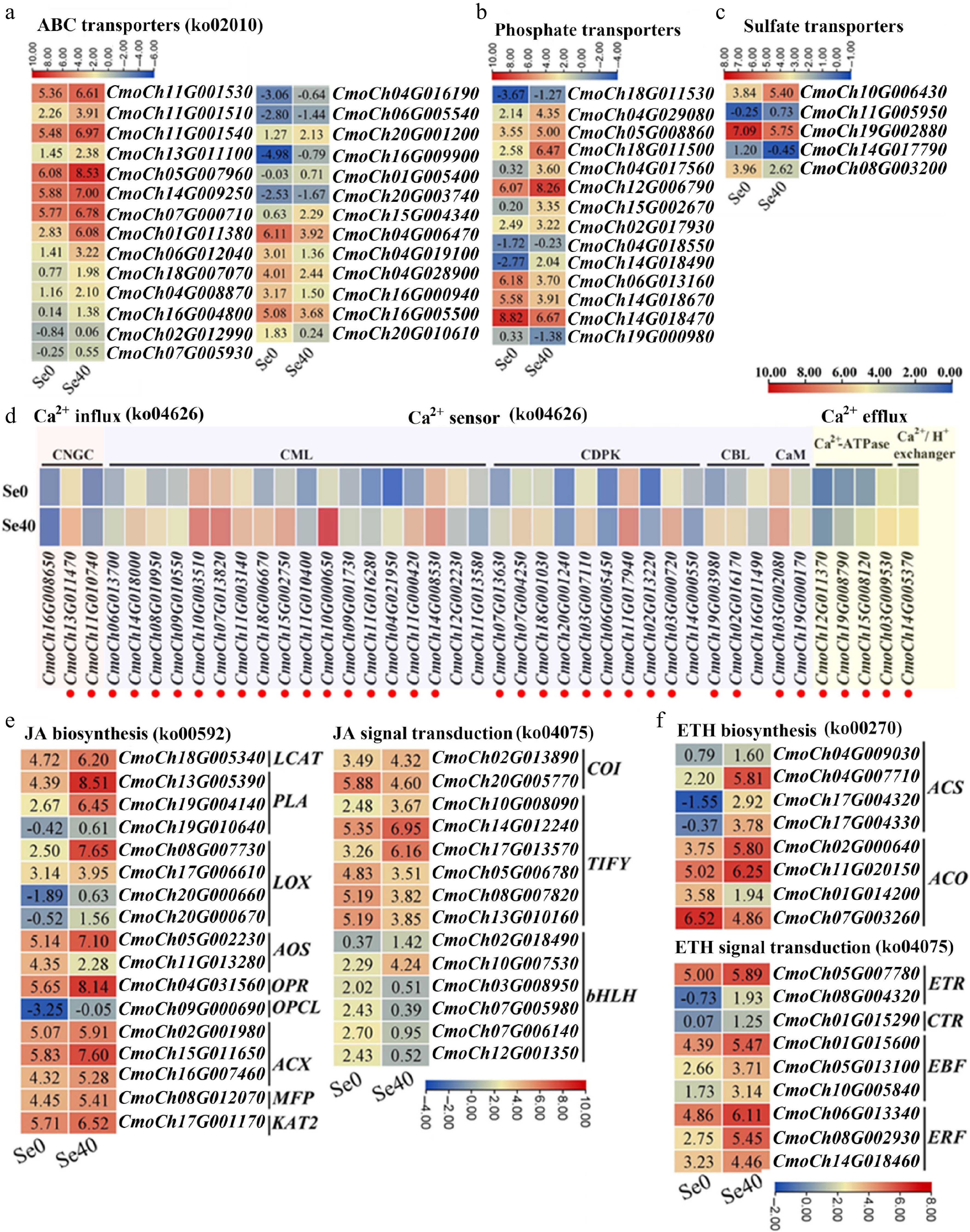 As shown in Fig. 5d and Supplementary Table S4, three DEGs were annotated as encoding cyclic nucleotide-gated ion channel (CNGC), and two of them showed significant upregulation under selenite stress. Additionally, selenite treatment resulted in differential expression of two calmodulin genes (CaMs), 18 CaM-like protein genes (CMLs), ten calcium-dependent protein kinase genes (CDPKs), and three calcineurin B-like protein genes (CBLs). Among these, the majority (both CaMs, 16 of 18 CMLs, nine of ten CDPKs, and two of three CBLs) exhibited significantly higher expression compared to the control (Fig. 5d; Supplementary Table S4). Notably, four CMLs (CmoCh10G000650, CmoCh04G021950, CmoCh11G00042, CmoCh11G000420) and one CBL (CmoCh19G003980) were upregulated > 10-fold by selenite. Furthermore, the CDPK-encoding gene CmoCh03G000720 displayed about 3.2-fold upregulation (Fig. 5d; Supplementary Table S4). Four DEGs annotated as Ca2+-ATPases and one as a Ca2+/H+ exchanger were also identified, all of which responded positively to selenite treatment (Fig. 5d; Supplementary Table S4). Collectively, these results suggest that selenite activates multiple components of calcium signaling pathways in WCO39 seedlings.