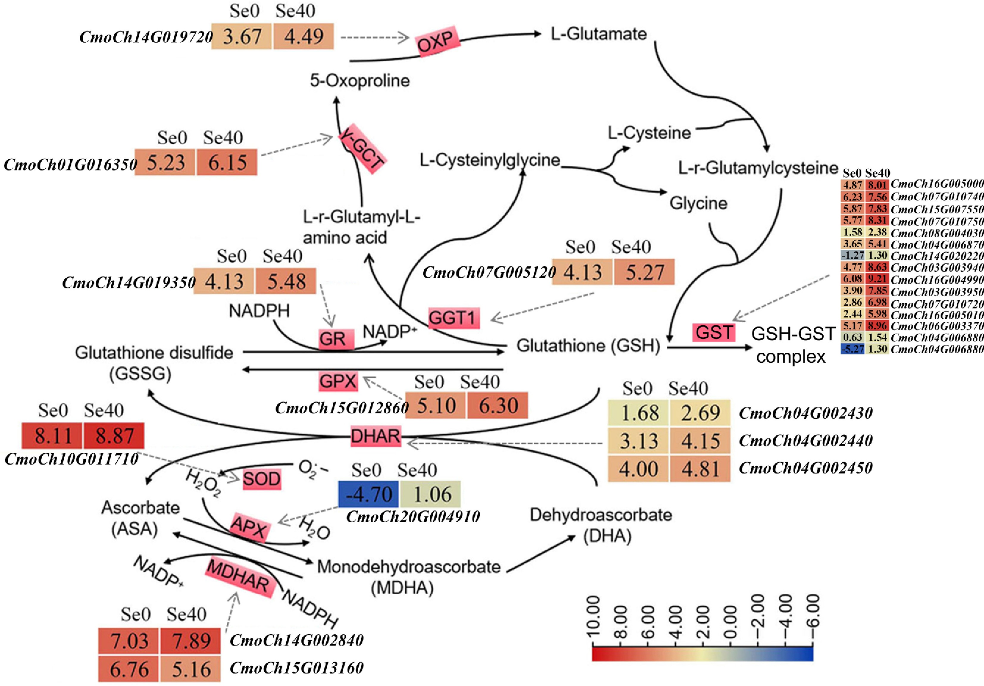 DEGs related to GSH and ASA-GSH cycles. The solid arrows indicate the substrates and products of the metabolic reaction. The dotted arrows represent the enzymes encoded by the corresponding DEGs identified in Se0 vs Se40 (Se0 as the control). The heatmaps represent the corresponding expression levels of DEGs, and the Log2 (FPKM) for each gene is shown in the appropriate grid.