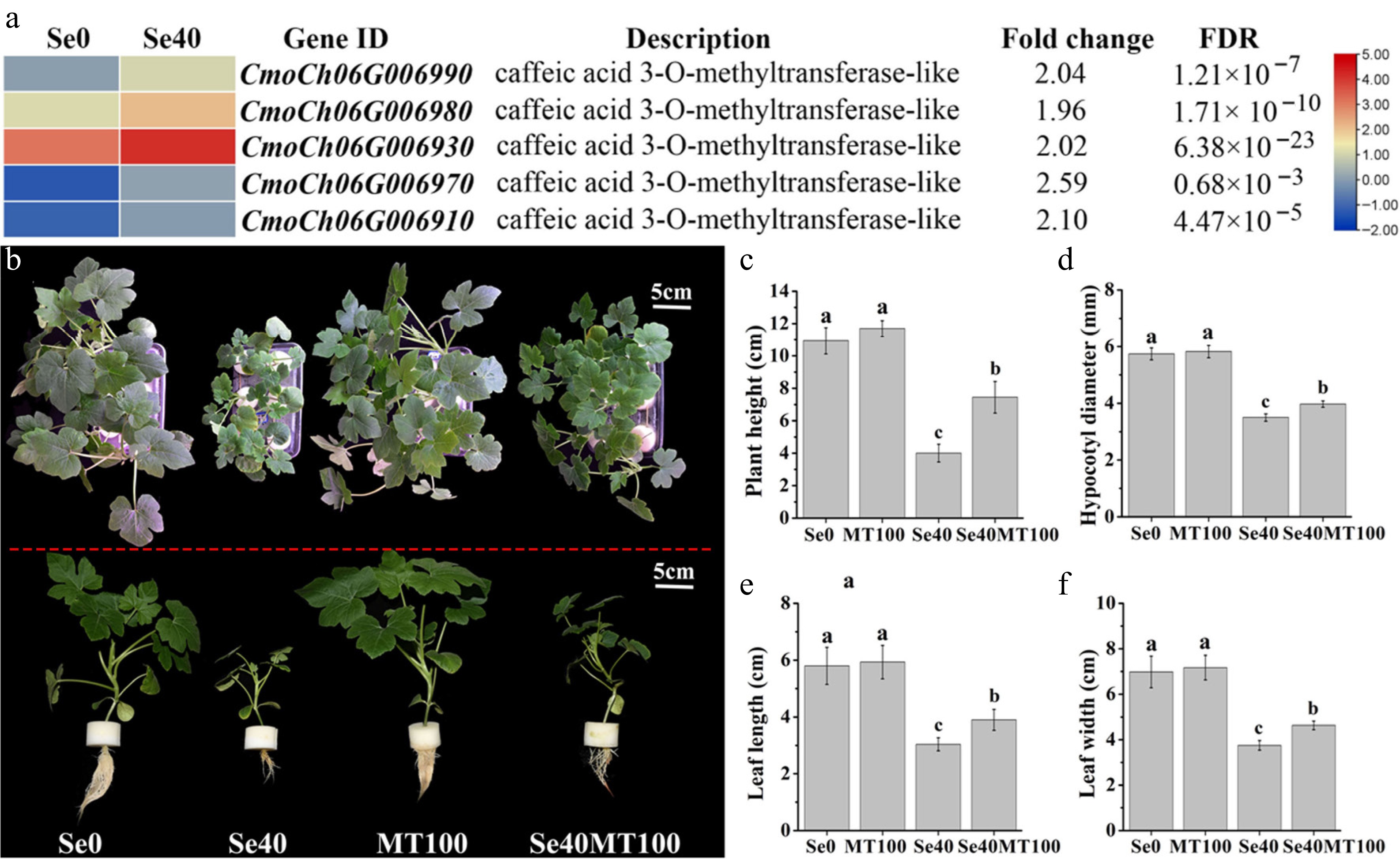 Analysis of DEGs involved in melatonin biosynthesis and the influence of exogenous melatonin treatment on selenite stress. (a) Heatmap showing DEGs annotated to encoding caffeic acid 3-O-methyltransferase. The Log2 (FPKM) for each gene is used to generate this heatmap. (b) Phenotypes of WCO39 seedlings under different treatments. (c)–(f) Statistical analysis of different growth indicators. Se0 represents normal seedlings; Se40 represents seedlings irrigated with 40 µM selenite; MT100 represents seedlings grown in normal culture with foliar application of 100 µM melatonin; Se40MT100 represents seedlings treated with 40 µM selenite and also sprayed with 100 µM melatonin. The data are shown as mean ± SD (n = 3). Different small letters on the bars stand for significant differences at p < 0.05 according to Duncan's multiple scope tests.