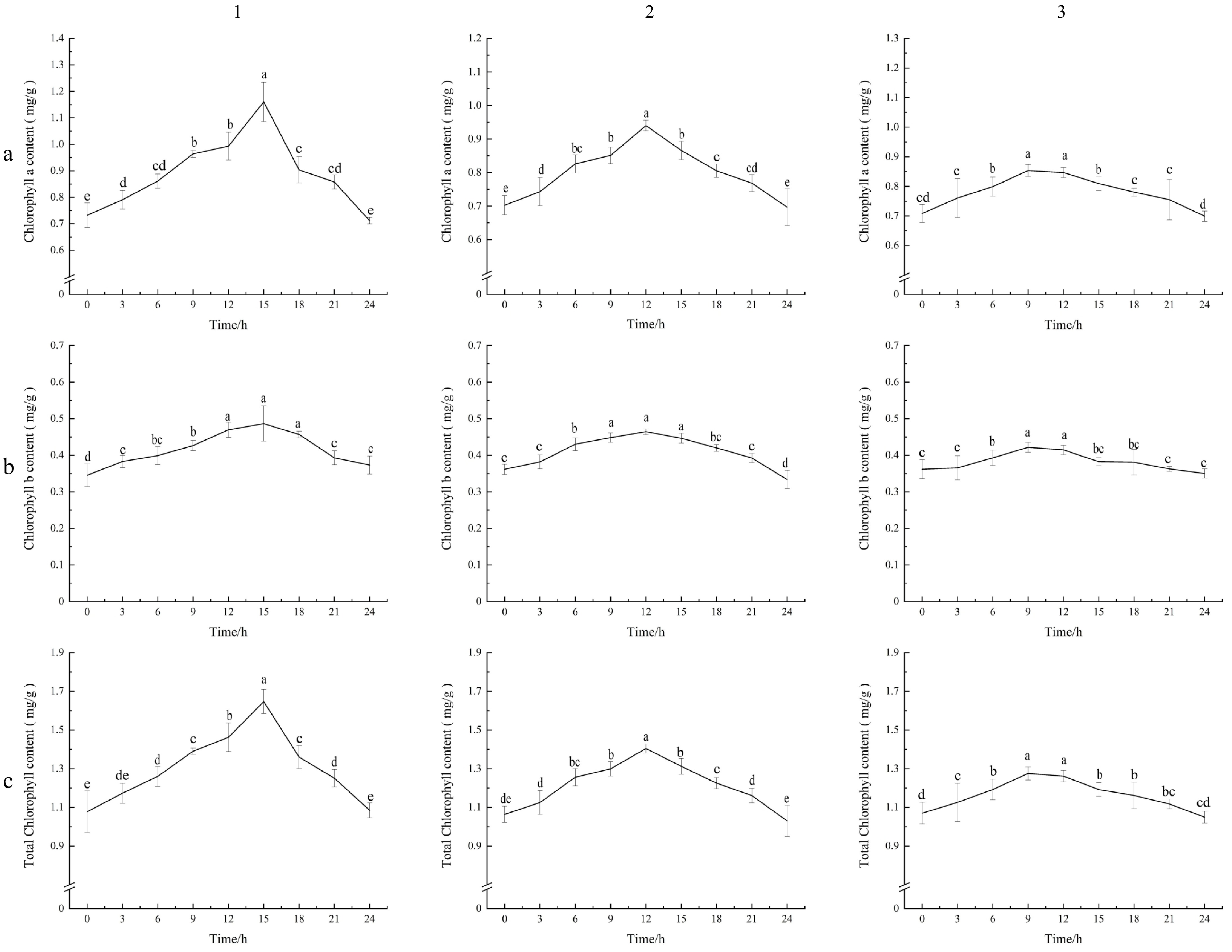 • The contents of chlorophyll a, chlorophyll b, and total chlorophyll of carrot leaves under 12L/12D and 16L/8D treatments were higher than those under 8L/16D conditions. Under 16L/8D conditions, the average chlorophyll a, chlorophyll b values of carrot leaves were 0.886 and 0.415, reaching the highest value of 1.160 and 0.486 after 15 h of treatment. Under 12L/12D conditions, the average chlorophyll a, chlorophyll b values of carrot leaves were 0.800 and 0.409, reaching the highest value of 0.940 and 0.464 after 12 h of treatment. Under 8L/16D conditions, the average chlorophyll a, and chlorophyll b values of carrot leaves were 0.779 and 0.381, reaching the highest value of 0.854 and 0.422 after 9 h of treatment. In this study, long photoperiod treatments significantly increased the chlorophyll a, chlorophyll b, and total chlorophyll values of carrot leaves. At the end of the light period, they return to a dark respiration state, reducing chlorophyll synthesis (Fig. 1).