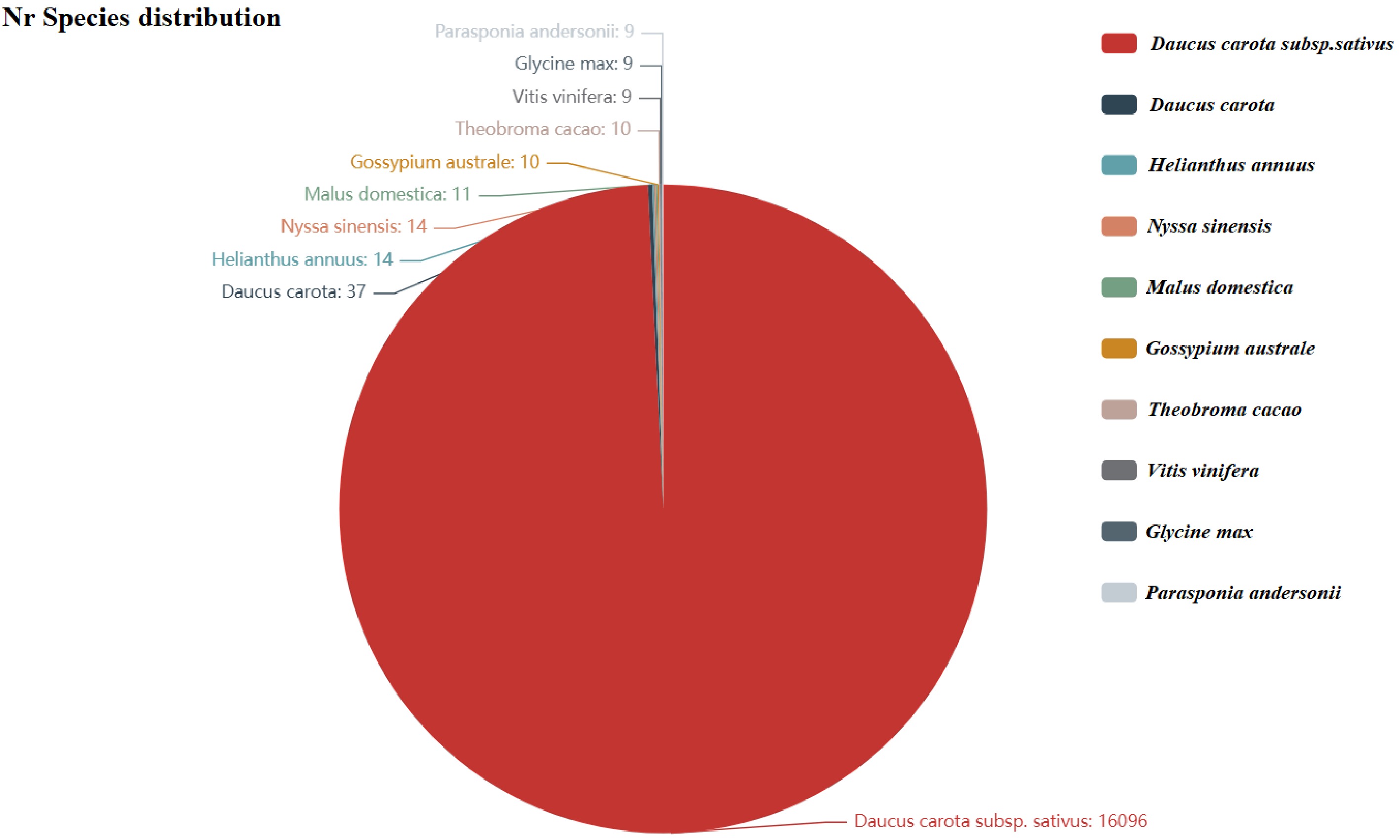 After assembly, 19,972 unigenes were compared with relevant databases, among which 16,519 were annotated in the NR database. Based on the NR database comparison results, the top 10 species with the most comparisons were counted, and the rest were categorized as other species. The top 10 species were: Daucus carota subsp. sativus (16,096), Daucus carota (37), Helianthus annuus (14), Nyssa sinensis (14), Malus domestica (11), Gossypium australe (10), Theobroma cacao (10), Vitis vinifera (nine), Glycine max (nine), Parasponia andersonii (nine) (Fig. 2, Supplementary Table S1).
