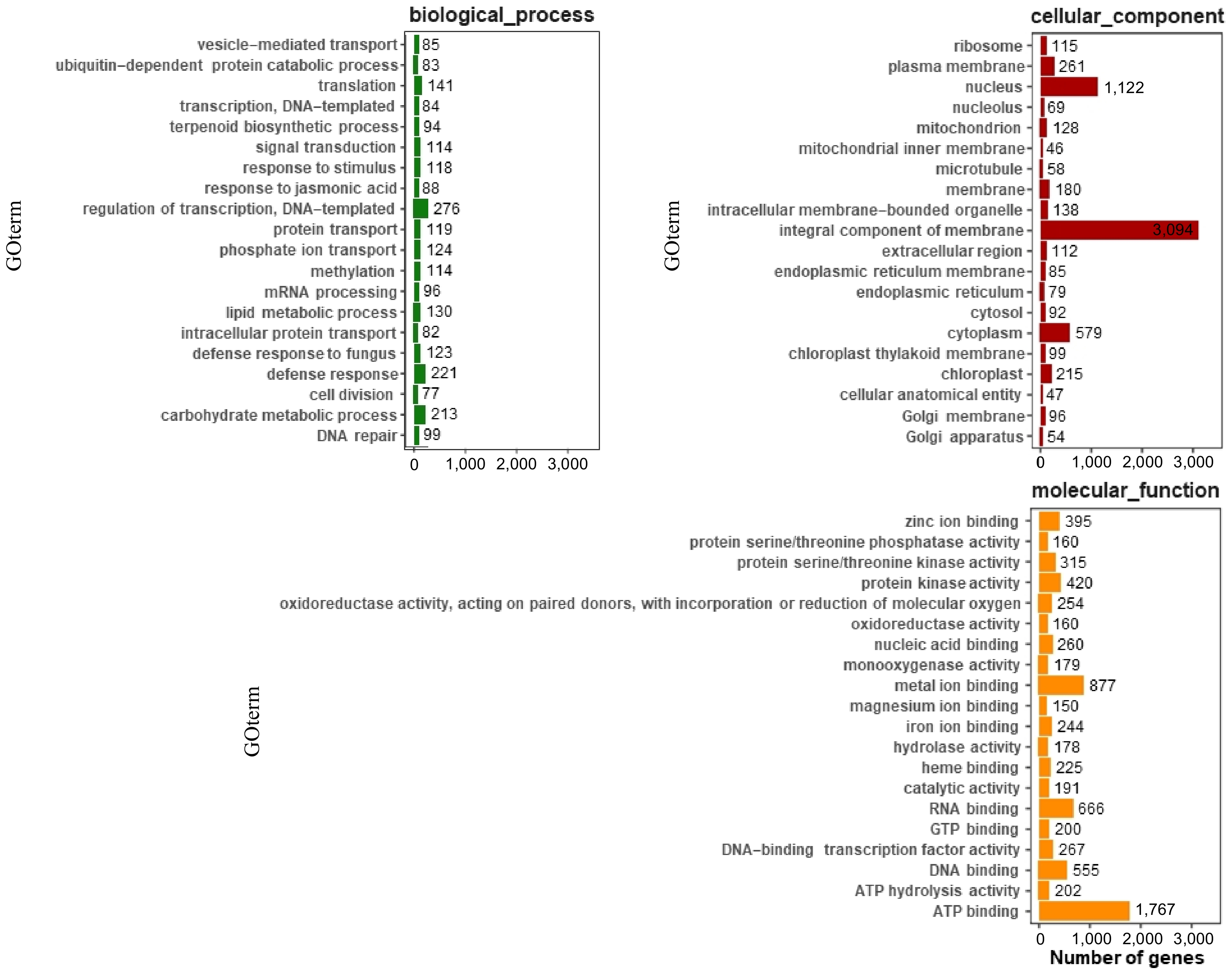 GO annotation of functional genes in carrot. The top 20 most annotated GO slim terms were selected in each category; each single-copy gene was classified into at least one GO term. All single-copy genes were divided into three categories: molecular function, cellular component, and biological process.