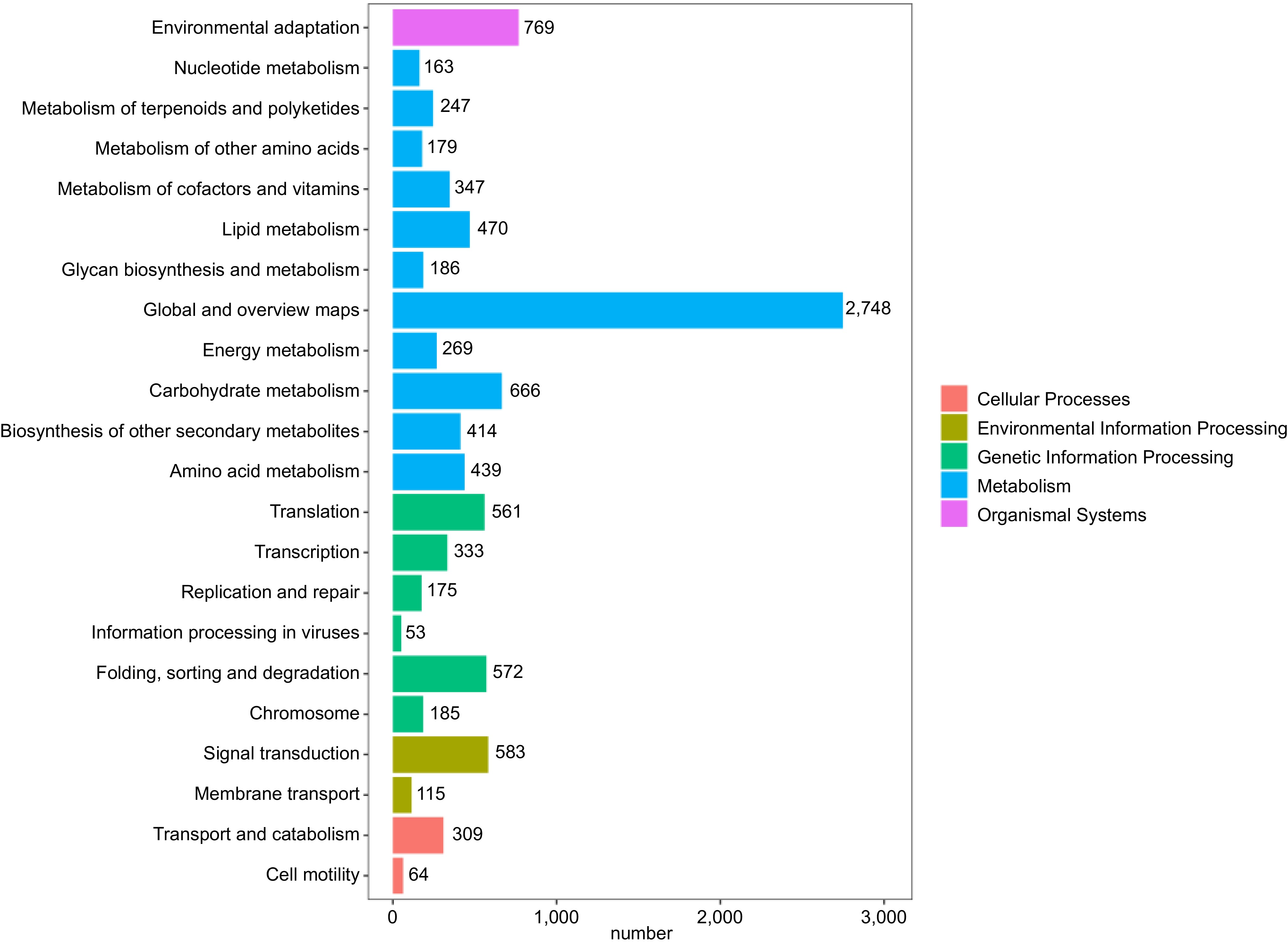 • Following KEGG annotation of the unigene sequences, they were grouped based on the KEGG metabolic pathways in which they participated (Fig. 4). A total of 8,050 individual gene clusters were identified. The categorization was structured into five distinct tiers: cellular processes, environmental information processing, genetic information processing, metabolism, and organismal systems. Metabolism was the largest category, with 11 sublevels. The first three categories of these 11 sublevel metabolic pathways were global and overview maps (1,750), carbohydrate metabolism (535), and amino acid metabolism (368). There were four sublevels of genetic information processing, with translation (759), and folding, sorting, and degradation (530) accounting for the majority.