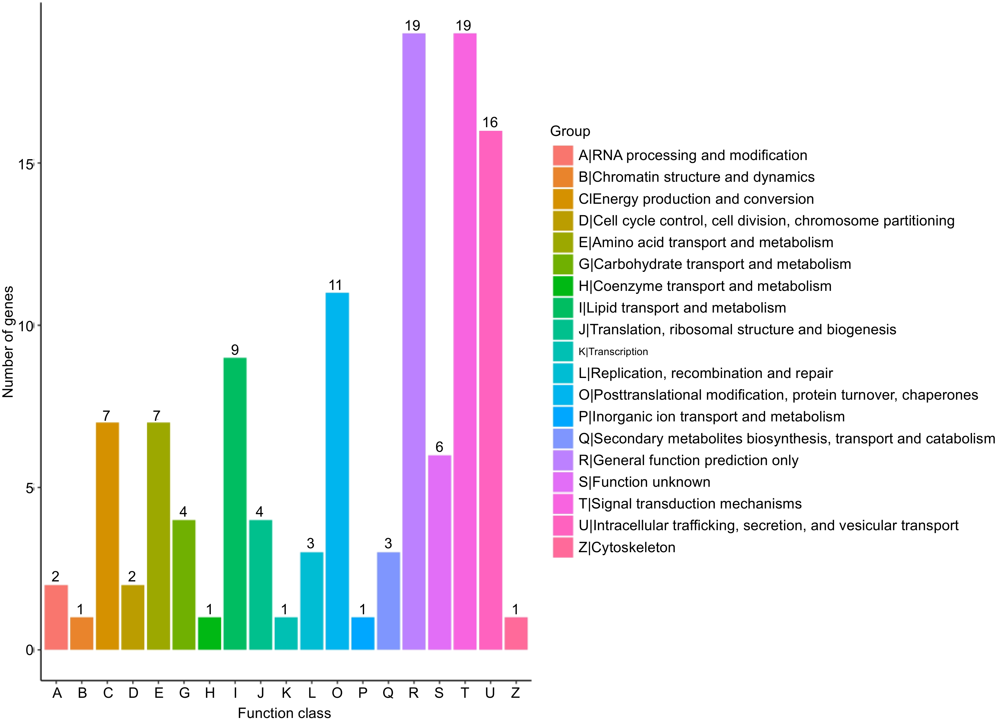 • The KOG database is a phylogenetic relational database specially constructed for eukaryotes. The KOG database divides eukaryotic genes into 18 different functional categories, which covers everything from basic biological processes to complex cellular functions. By KOG annotation of unigenes, they can be classified according to the KOG functional group. A total of 98 sequences were classified in the KOG database. Of the 18 KOG classes, 10 (10.20%) of the single gene function was not yet clear. Among the categories with known functions, 'posttranslational modification, protein turnover, chaperones' was the largest category, containing 36 single genes, accounting for 36.73% of the total. The importance of this category lies in the fact that it involved the ultimate maturation, stability, and functional regulation of proteins, which are all critical steps for proteins within cells to function properly. This was followed by the 'general function prediction only' category, which contains 28 single genes, accounting for 28.57% of the total. As shown in Fig. 5, this category may include some genes that have a wide range of functions, or are not yet well understood.