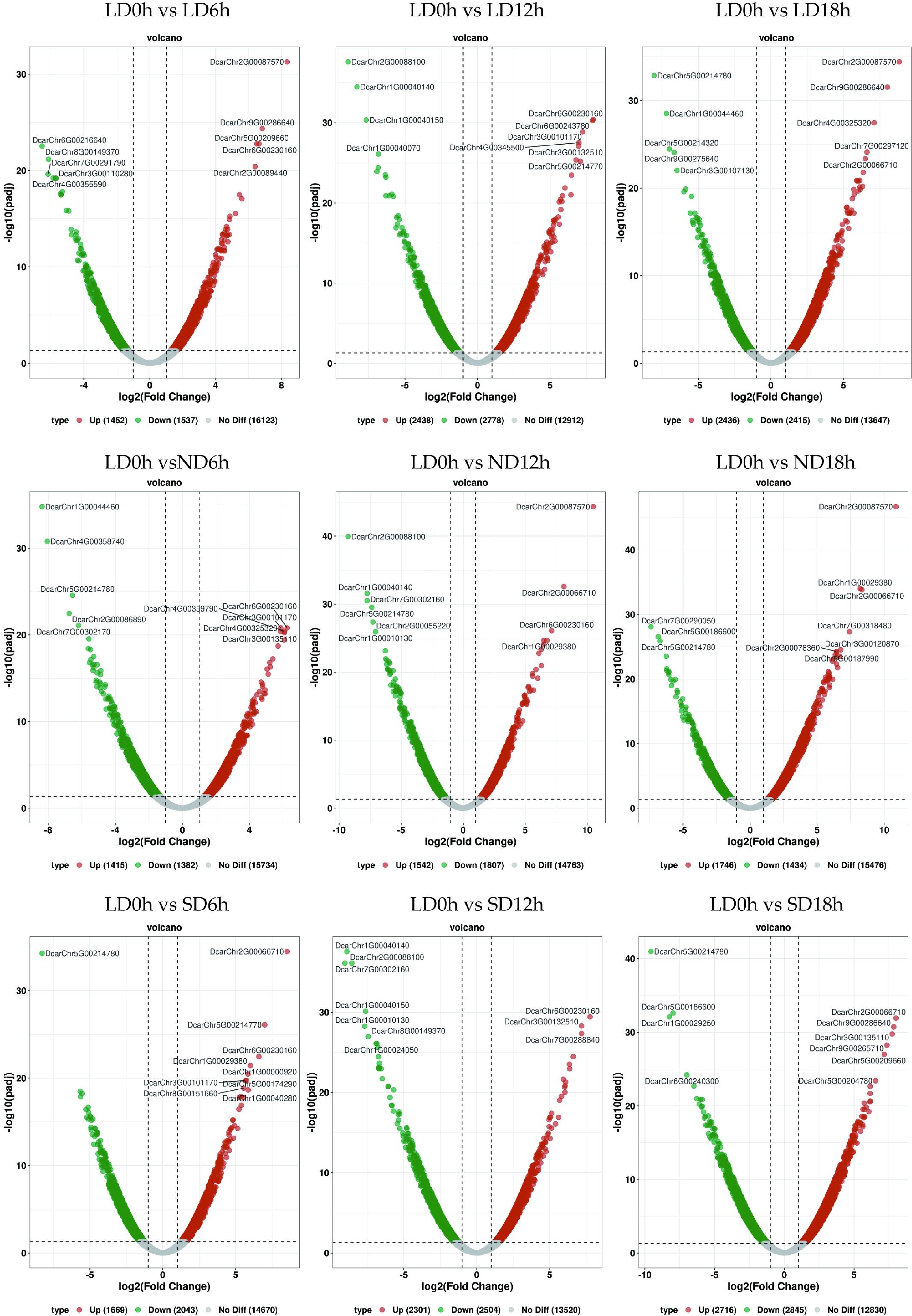 • Comparing carrot leaves at 10 different time points (LD0 h, LD6 h, LD12 h, LD18 h, ND6 h, ND12 h, ND18 h, SD6 h, SD12 h, SD18 h) with the initial time T0h, multiple differentially expressed genes (DEGs) were identified, and the overall distribution of different genes was inferred using volcano plots (Fig. 6, Supplementary Table S2). The results showed that LD0 h and LD6 h co-expressed 2,989 differentially expressed genes, of which 1,452 were upregulated and 1,537 were downregulated. LD0 h and LD12 h expressed 5,216 differentially expressed genes, with 2,438 upregulated and 2,778 downregulated. LD0 h and LD18 h co-expressed 4,851 differentially expressed genes, including 2,436 upregulated and 2,415 downregulated. LD0 h and SD6 h co-expressed 3,712 differentially expressed genes, with 1,669 upregulated and 2,043 downregulated. LD0 h and SD12 h co-expressed 4,805 differentially expressed genes, including 2,301 upregulated and 2,504 downregulated. LD0 h and SD18 h co-expressed 5,561 differentially expressed genes, with 2,716 upregulated and 2,845 downregulated. LD0 h and ND6 h co-expressed 2,797 differentially expressed genes, of which 1,415 were upregulated and 1,382 downregulated. LD0 h and ND12 h co-expressed 3,349 differentially expressed genes, with 1,542 upregulated and 1,807 downregulated. LD0 h and ND18 h co-expressed 3,180 differentially expressed genes, including 1,746 upregulated and 1,434 downregulated.