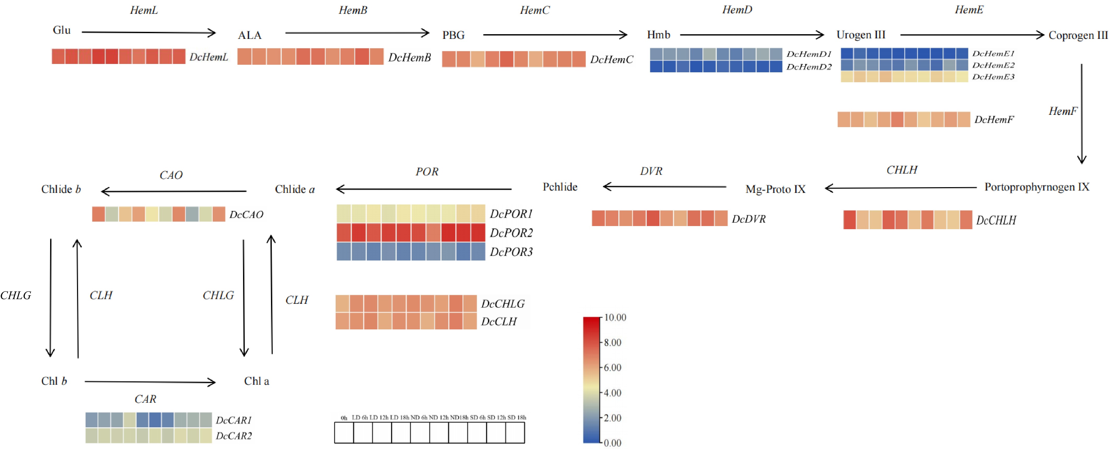• In this study, high-throughput transcriptomics technology was employed to analyze the response of chlorophyll metabolism in carrots to photoperiod changes. The research results show that photoperiod has a significant impact on the photosynthetic characteristics and chlorophyll synthesis of carrot plants. Under the condition of 16L/8D, the correlation values between photosynthesis and chlorophyll content increased significantly. The coordinated action of the Hem, CHLH, POR, CHLG, CAO, DVR, and CLH genes constitutes the core enzymatic and regulatory framework governing the chlorophyll life cycle. Although operating within a parallel biosynthetic pathway, the genes are intrinsically linked to this network, providing essential photoprotection, and structural support for chlorophyll-protein complexes. This integrated metabolic network is subject to multi-layered regulatory control spanning transcriptional, post-transcriptional, post-translational, and retrograde signaling mechanisms ensuring chlorophyll homeostasis is maintained in synchrony with developmental programs and environmental cues. Future research should prioritize elucidating the precise mechanisms of crosstalk between these pathways, the spatial organization of key enzymes within chloroplasts, and the fine-tuning of gene expression networks to optimize photosynthetic performance.