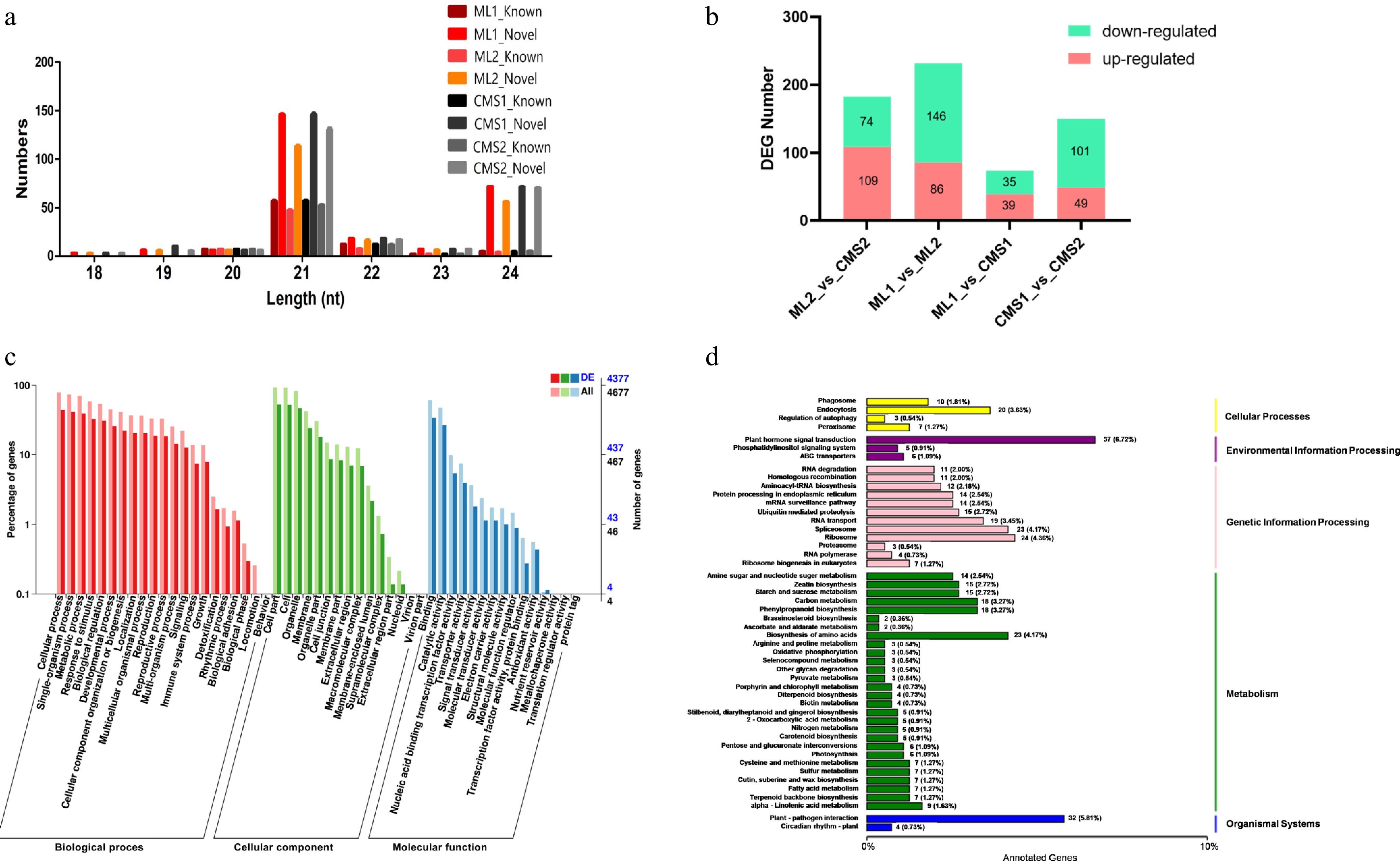 Sequencing results of miRNAs in different pollen development periods of Ogura-type cytoplasmic male sterile and maintainer lines of Chinese cabbage. CMS1 refers to the early stage of pollen development in sterile lines, CMS2 refers to late pollen development in sterile lines, ML1 refers to the early development of pollen in the retention line, ML2 refers to the late stage of pollen development in the maintenance line. (a) Length statistics of known miRNAs and new miRNAs. (b) Statistics on the number of differentially expressed miRNAs in Ogura-type cytoplasmic male sterile and maintainer lines of Chinese cabbage during different pollen developmental periods. (c) GO annotation of target mRNAs of differentially expressed miRNAs in two lines of Chinese cabbage during late pollen development (ML2 vs CMS2). (d) KEGG pathway enrichment of target mRNAs of differentially expressed miRNAs in two lines of Chinese cabbage during late pollen development (ML2 vs CMS2).
