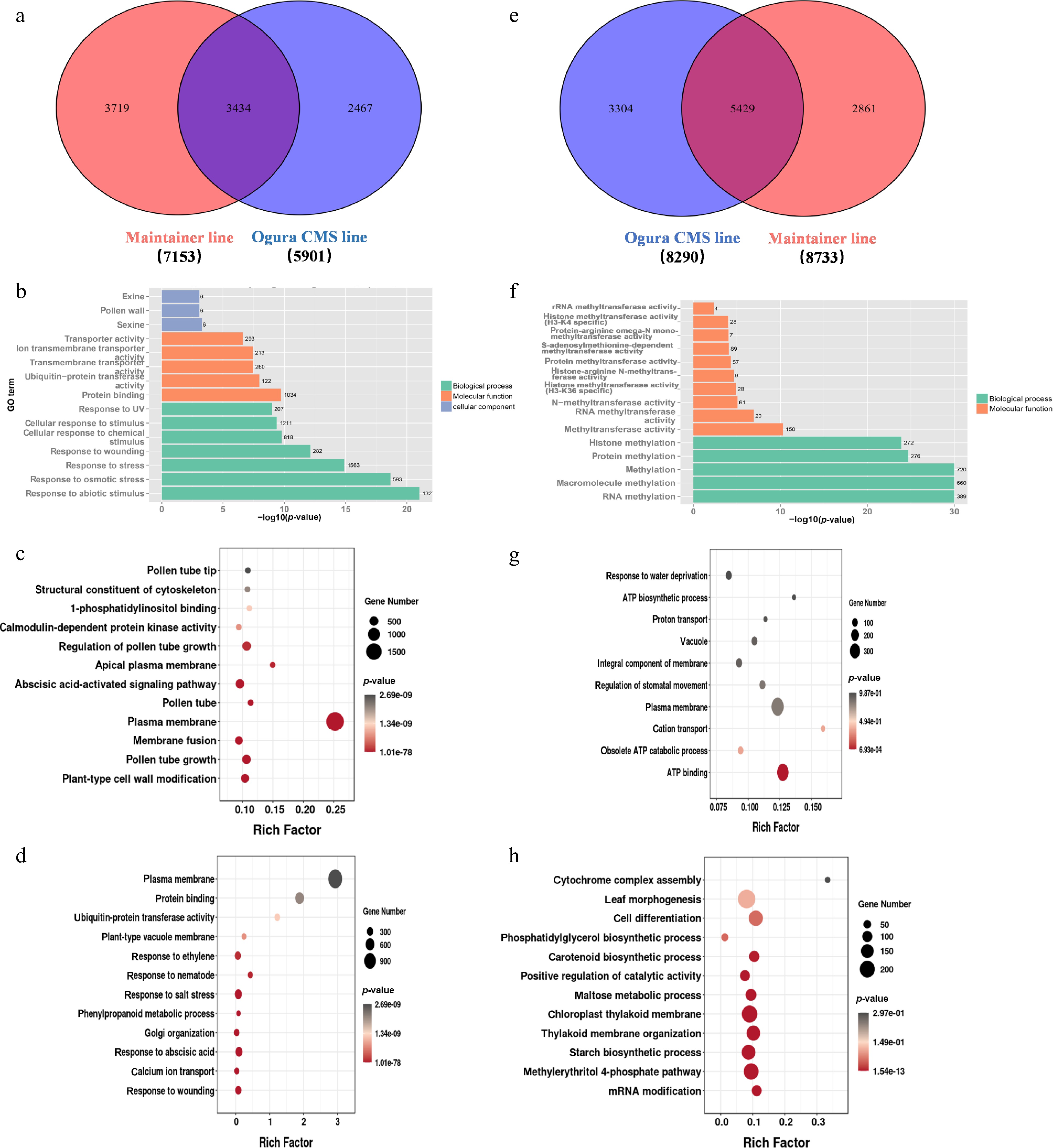 Functional enrichment analysis of late-stage differentially expressed genes (DEGs) in Chinese cabbage Ogura CMS and maintainer lines. (a) Venn diagram quantifying upregulated DEGs: co-expressed and line-specific. (b) GO enrichment of co-expressed upregulated DEGs. (c) GO enrichment of maintainer line-specific upregulated DEGs. (d) GO enrichment of Ogura CMS line-specific upregulated DEGs. (e) Venn diagram quantifying downregulated DEGs: co-expressed and line-specific. (f) GO enrichment of co-expressed downregulated DEGs. (g) GO enrichment of maintainer line-specific downregulated DEGs. (h) GO enrichment of Ogura CMS line-specific downregulated DEGs.