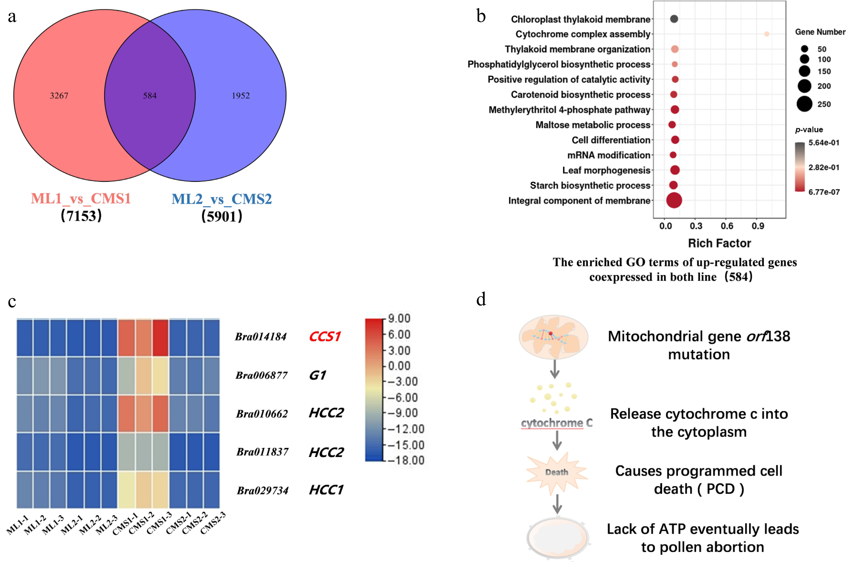 Intergroup comparison of upregulated differential gene expression between Chinese cabbage Ogura CMS and maintainer lines. (a) Number of differentially expressed genes specifically expressed and co-expressed between the two groups. (b) GO enrichment analysis of co-expressed upregulated genes between the two groups. (c) Heatmap of cytochrome c-related differential genes in the Chinese cabbage Ogura CMS and maintainer lines. (d) Predictive analysis of the signaling pathway of the downstream cytochrome c response to the mitochondrial mutation.