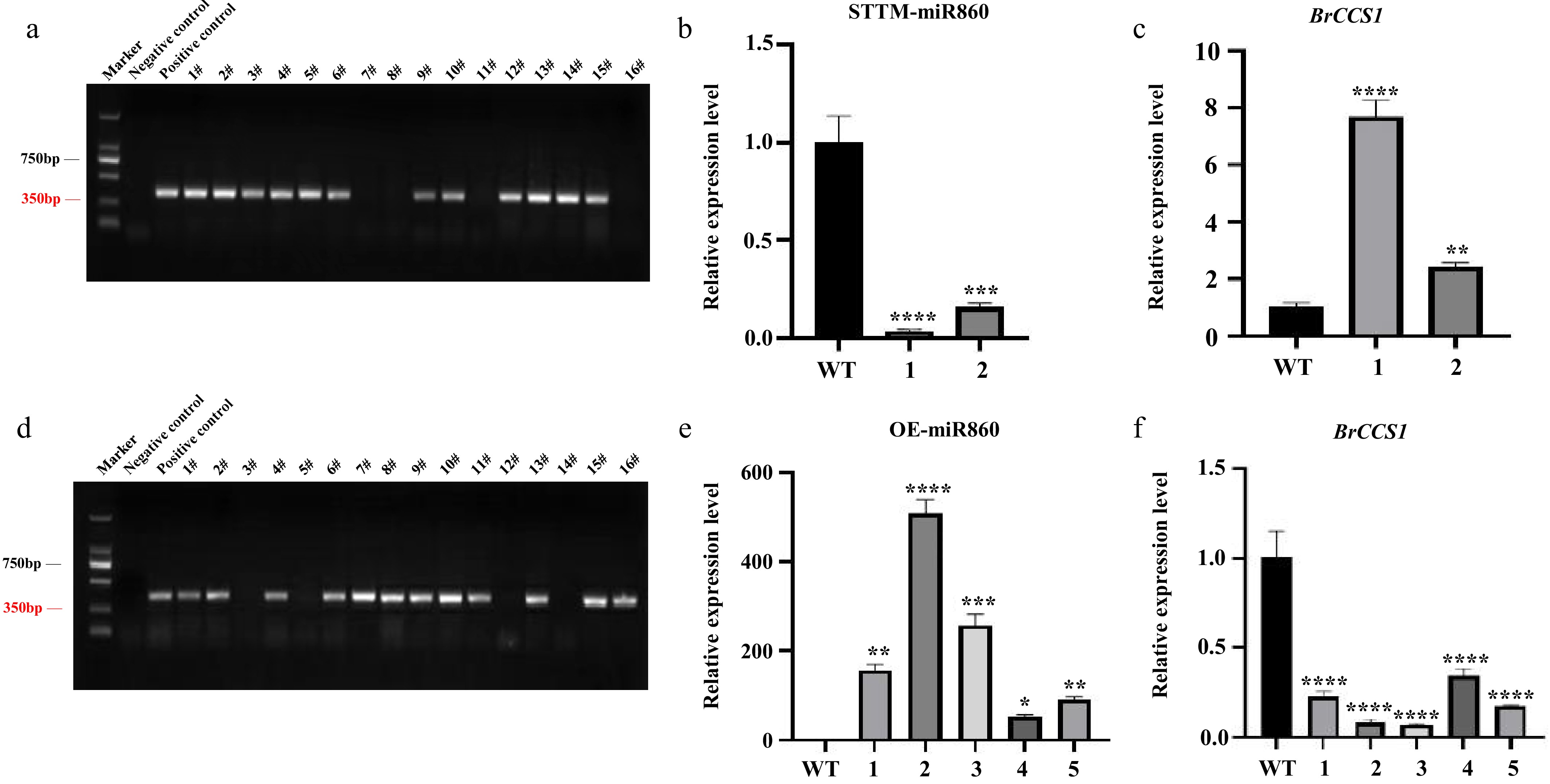 Identification of transgenic Arabidopsis thaliana. (a), (d) PCR identification of T1 generation STTM-miR860 and OE-miR860 transgenic Arabidopsis. (b), (c) qRT-PCR results of miR860 and its target gene BrCCS1 in the T2 generation of STTM-miR860 transgenic Arabidopsis thaliana. (e,) (f) qRT-PCR results of miR860 and its target gene BrCCS1 in the T2 generation of OE-miR860 transgenic Arabidopsis thaliana. One-way ANOVA using multiple tests (* p < 0.05; ** p < 0.01; *** p < 0.001; **** p < 0.0001).