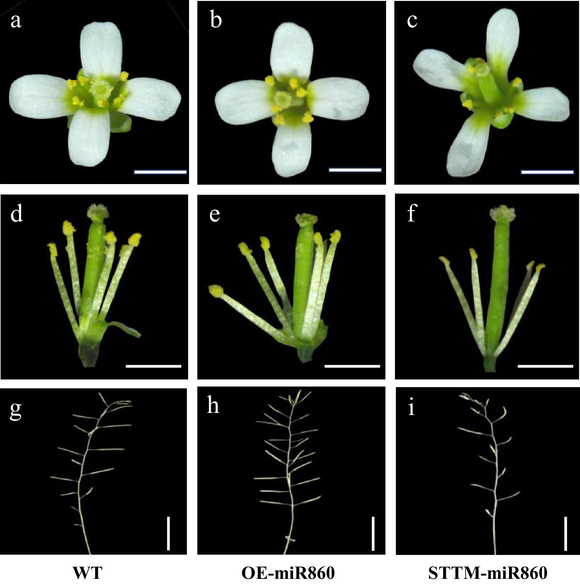 Observation of the phenotypic characteristics of the wild type and miR860 mutant of T3. (a)–(c) Observation of wild-type and miR860 mutant inflorescences. (d)–(f) Observation of anthers and stigmas at anthesis of the wild type and miR860 mutants. (g), (h) Observation of wild-type and miR860 mutant siliques. Scale bars = (a)–(f) 0.5 mm, (g)–(i) 1 cm.