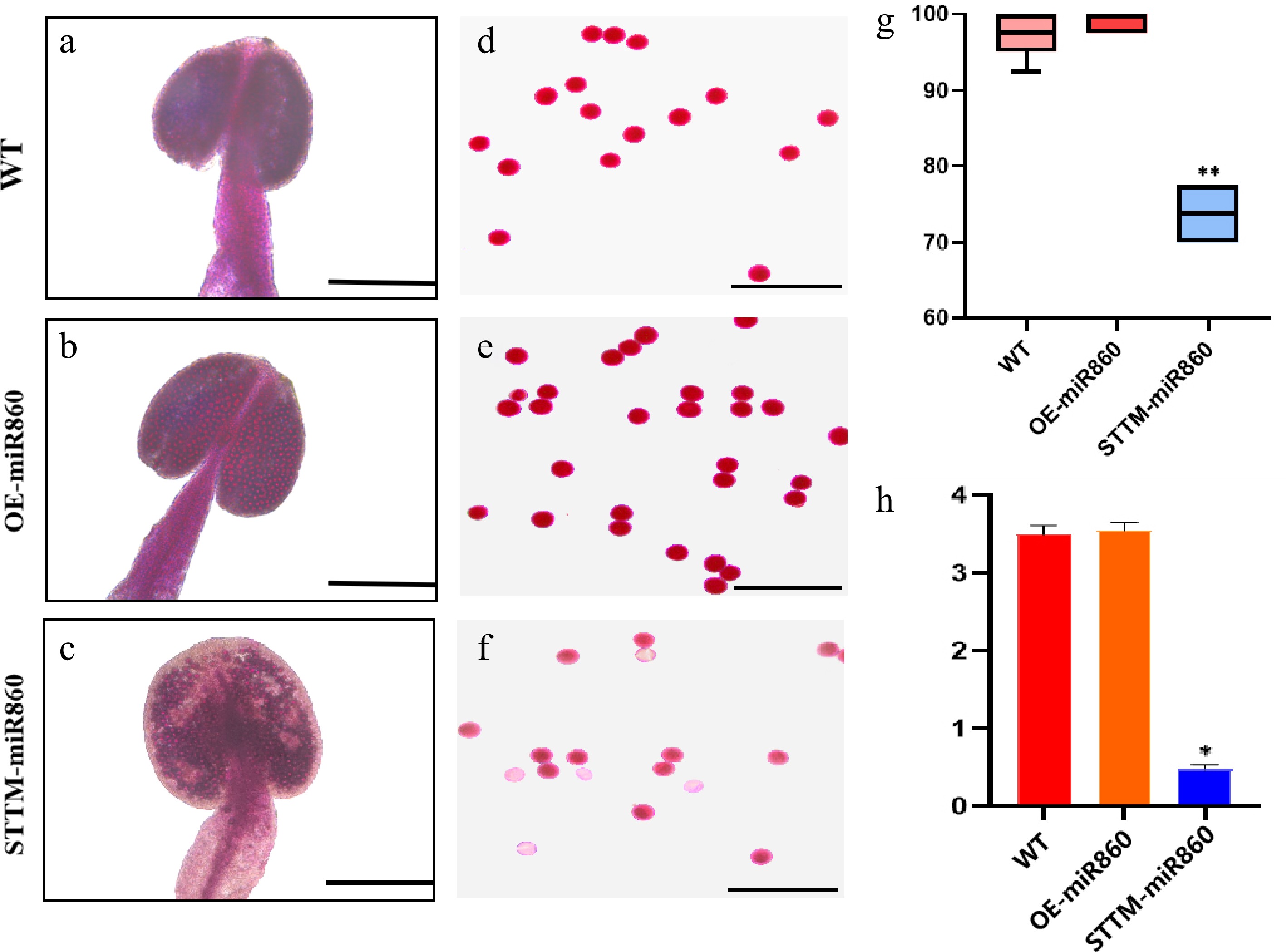 Identification of pollen viability and determination of ATP content in the wild type and miR860 mutants. (a)–(c) Alexander rectification staining of anthers. Scale bar = 200 μm. (d)–(f) Alexander staining of pollen grains. Scale bar = 100 μm. (g) Stainability statistics (%). (h) ATP content determination (µmol/g). One-way ANOVA using multiple tests (* p < 0.05; ** p < 0.01).