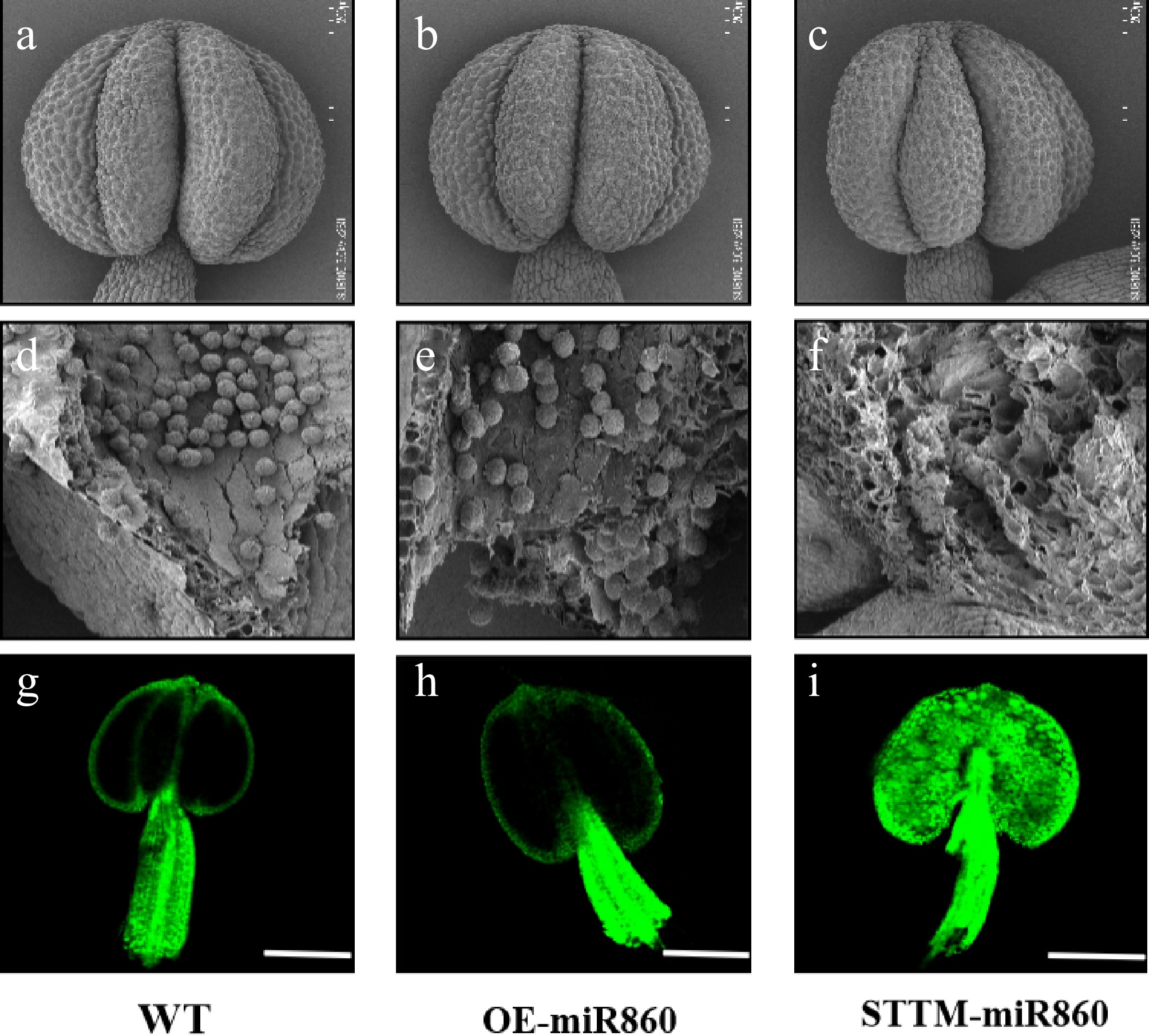 Ultrastructural scanning electron microscopy observation and identification of reactive oxygen species in wild-type and miR860 mutant anthers. (a)–(c) Wild-type and miR860 mutant anthers at the unopened stage. (d), (e) Wild-type and OE-miR860 anthers with normal full pollen grains. (f) STTM-miR860 mature anthers at the unopened stage, locally enlarged to show empty chambers. Scale bars: (a)–(c) 200 μm, (d)–(f) 50 μm. (g)–(i) Confocal microscopy observation of reactive oxygen staining. Scale bar = 200 μm.