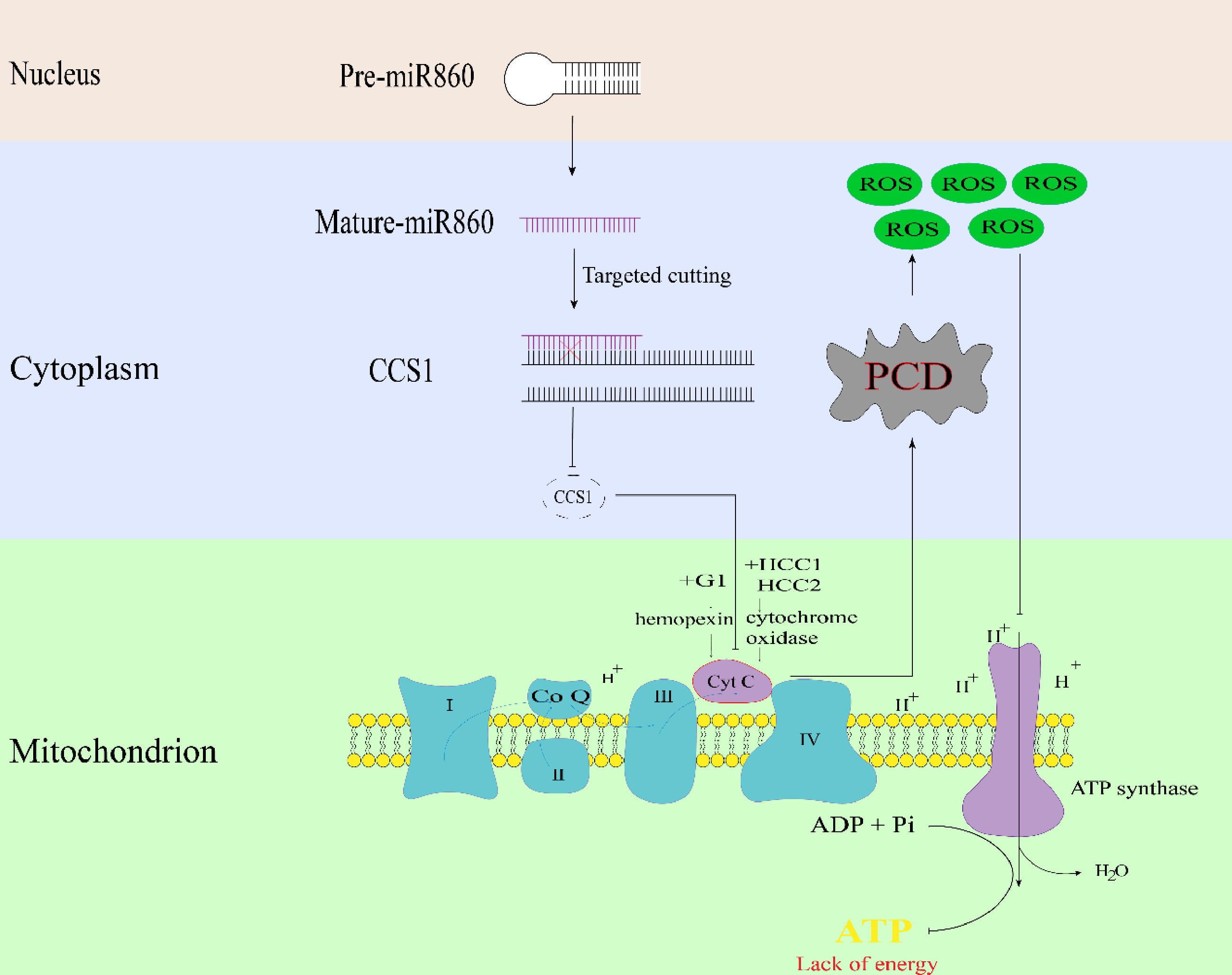 Based on the results of the above studies, a pattern of pollen abortion triggered by mutations in the mitochondrial gene orf138 was explored (Fig. 8). Mutations in the mitochondrial gene orf138, which regulates the expression level of miR860, negatively regulate the upregulation of cytochrome c synthesis-related gene CCS1, accelerating the downstream synthesis of excess cytochrome c released into the cytoplasm, resulting in the early onset of PCD of the tapetum layer, which leads to the accumulation of large quantities of ROS, blocking the synthesis of downstream ATP, and the lack of energy, resulting in the prevention of normal pollen wall formation, ultimately leading to pollen exhaustion. In conclusion, this model elucidates the mechanism of bra-miR860 in cytoplasmic male sterility, provides new insights into the mechanism of cytoplasmic male sterility in this species, further lays a theoretical foundation for the study of sterile lines in Chinese cabbage and provides new ideas for hybrid seed production and other practical applications.
