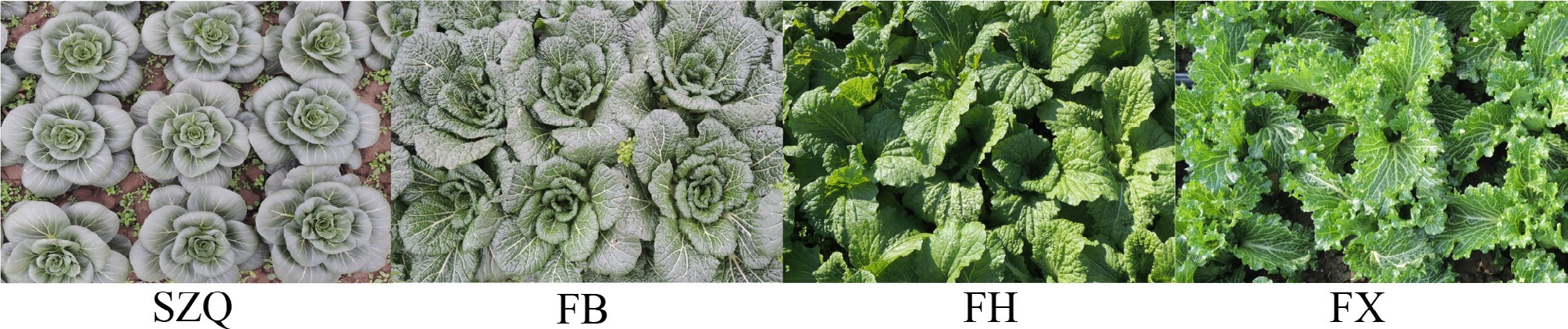 The four NHCC cultivars exhibited distinct morphological variations in plant architecture, leaf color, and leaf morphology ( Fig. 1). Cultivar 'SZQ' displayed a compact, upright rosette habit with smooth, grayish-green leaves, and entire margins. In contrast, 'FB' showed a semi-upright, looser rosette characterized by darker green leaves with slight blistering and entire margins. The other two cultivars, 'FH' and 'FX', both exhibited semi-upright and loose plant architectures with yellowish-green leaves and slight blistering. However, they were distinguished by their leaf margins: 'FH' had wavy margins, whereas 'FX' had serrated margins with prominent venation.