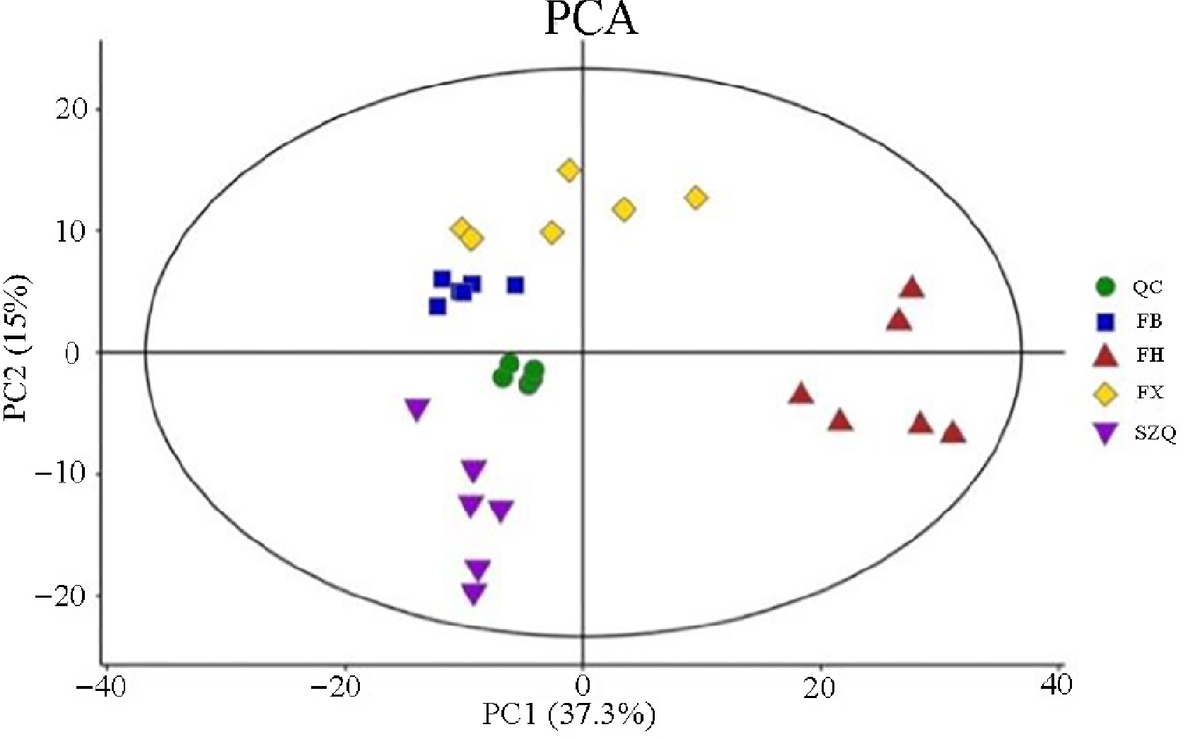 The principal component analysis (PCA) model revealed distinct metabolic profiles among the four NHCC cultivars ( Fig. 2). The score plot showed tight clustering of the six biological replicates for each cultivar, demonstrating high experimental reproducibility and minimal intra-cultivar variation. Within the 95% confidence interval, cultivars FB and FX clustered closely, suggesting a similar metabolic composition, while FH and SZQ were clearly separated. Furthermore, the QC samples formed a tight cluster in the center of the plot, indicating excellent instrumental stability throughout the analysis.