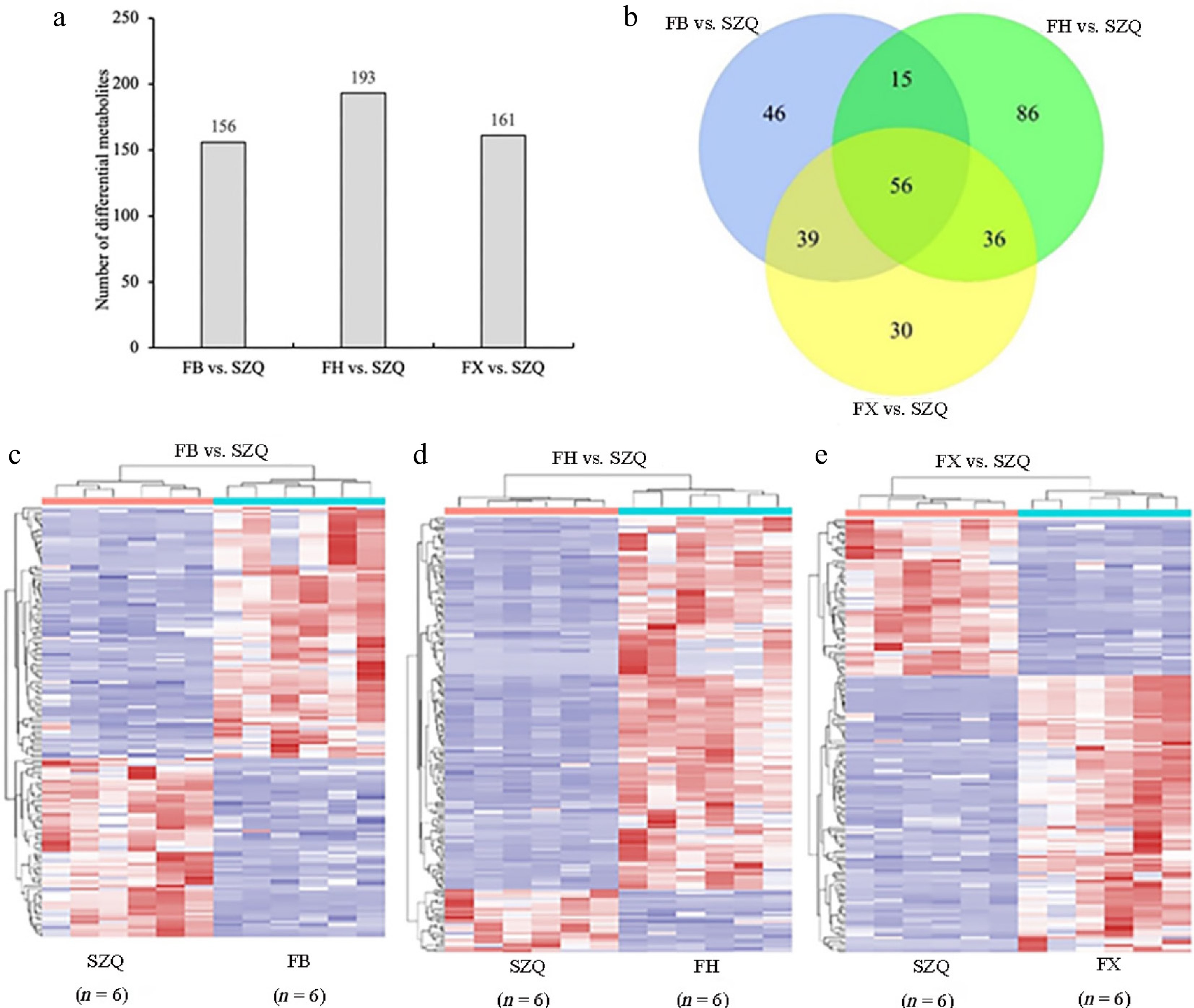Differential metabolites of FB vs. SZQ, FH vs. SZQ, and FX vs. SZQ. (a) The bar chart shows the number of differential metabolites among the cultivar comparison. (b) Venn diagram illustrating the overlap of differential volatile compounds among the comparison groups. (c) Heatmap of differential metabolites in FB vs. SZQ ( n = 6). (d) Heatmap of differential metabolites in FH vs. SZQ ( n = 6). (e) Heatmap of differential metabolites in FX vs. SZQ ( n = 6).