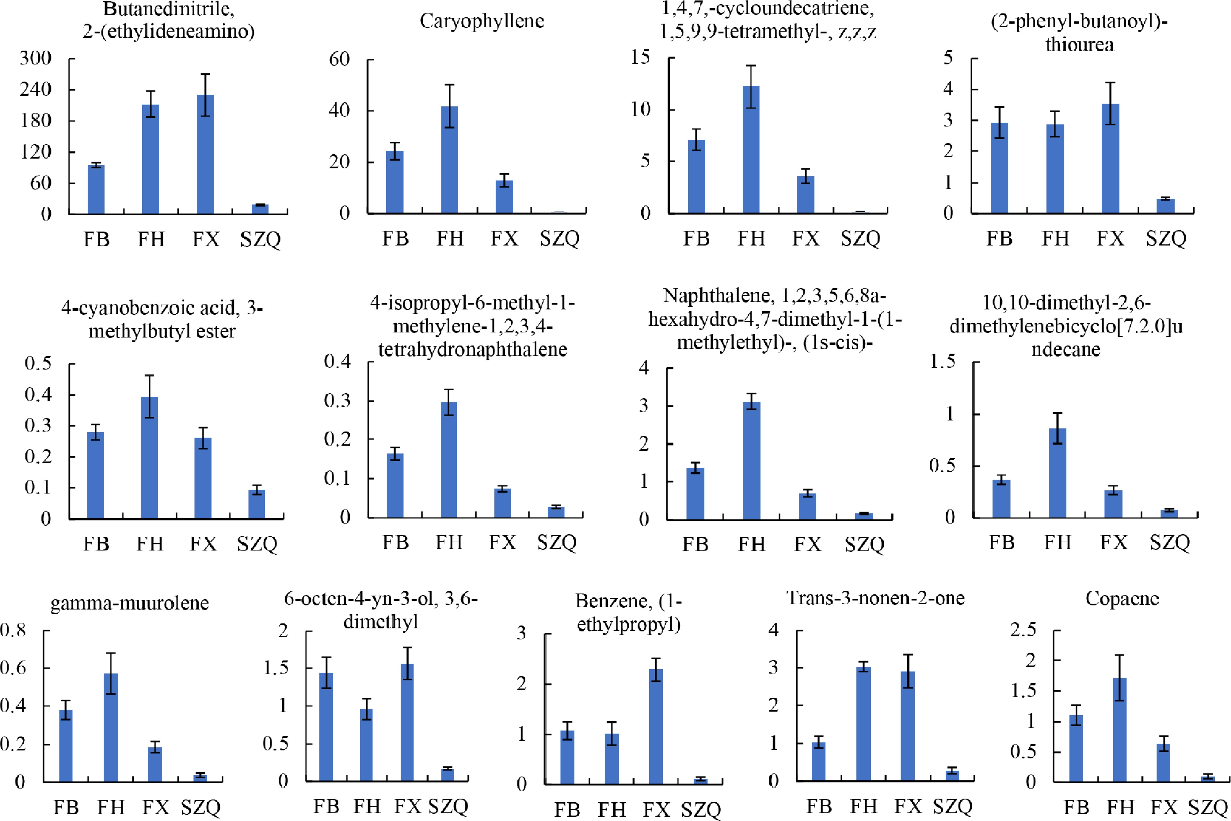 The contents of 13 volatile compounds were identified as being significantly different in comparison with the SZQ cultivar. The Y-axis represents the expression level (abundance) of each differential metabolite. Values are presented as mean ± SE ( n = 6).