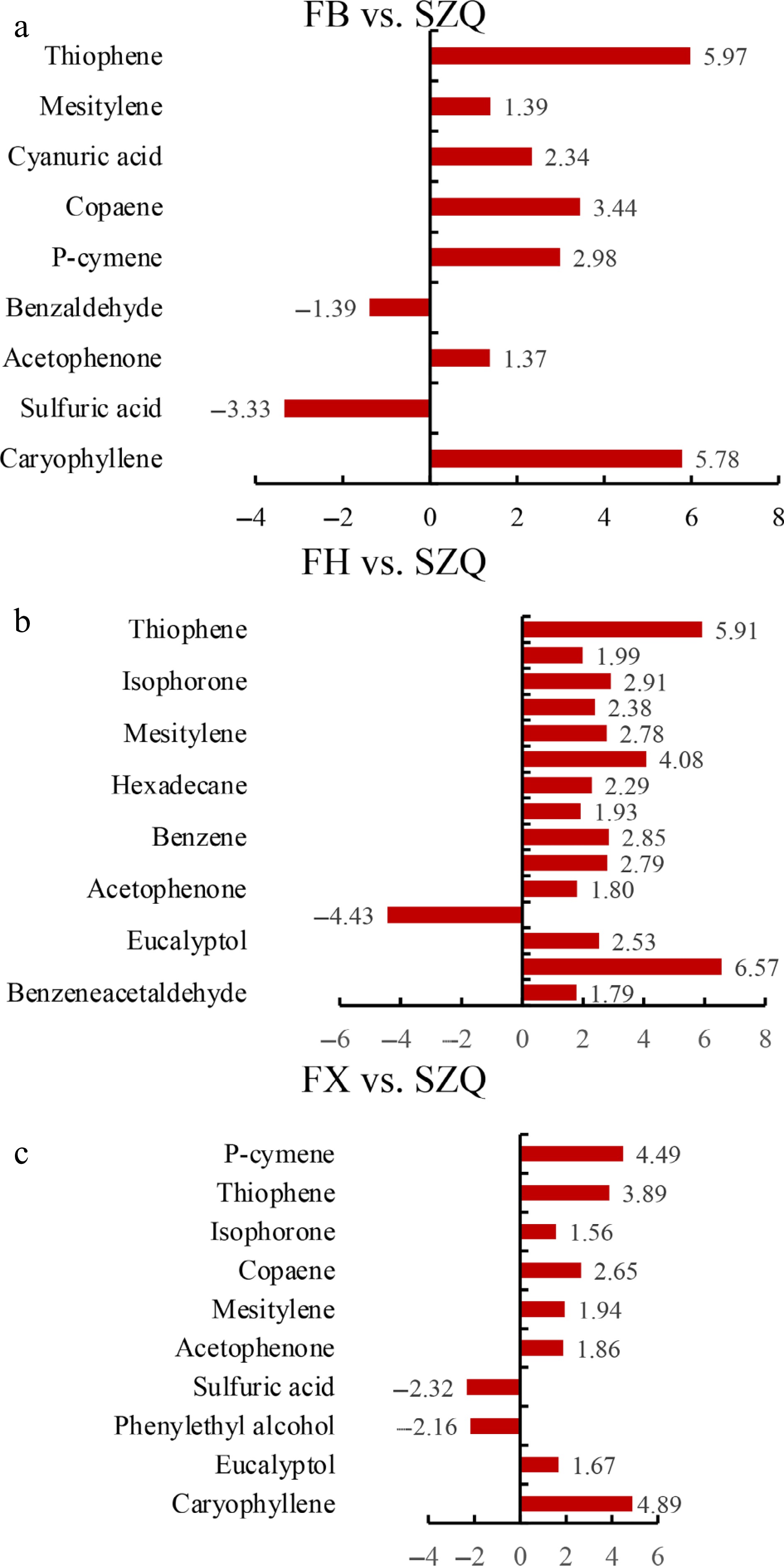 In the FB vs. SZQ comparison, the up-regulated metabolites included thiophene, mesitylene, cyanuric acid, copaene, P-cymene, acetophenone, and caryophyllene, whereas sulfuric acid and benzaldehyde were down-regulated ( Fig. 5a). For FH vs. SZQ, 15 metabolites were enriched in KEGG pathways, nearly all of which were upregulated; phenethyl alcohol was the sole compound observed to be down-regulated ( Fig. 5b). In the FX vs. SZQ comparison, 10 metabolites were enriched, comprising two alkenes (caryophyllene and copaene), two alcohols (eucalyptol and phenylethyl alcohol), two ketones (acetophenone and isophorone), 1 benzene (mesitylene), one monoterpene (P-cymene), one acid (sulfuric acid), and one aromatic heterocyclic compound (thiophene). Among these, sulfuric acid and phenylethyl alcohol were downregulated ( Fig. 5c).