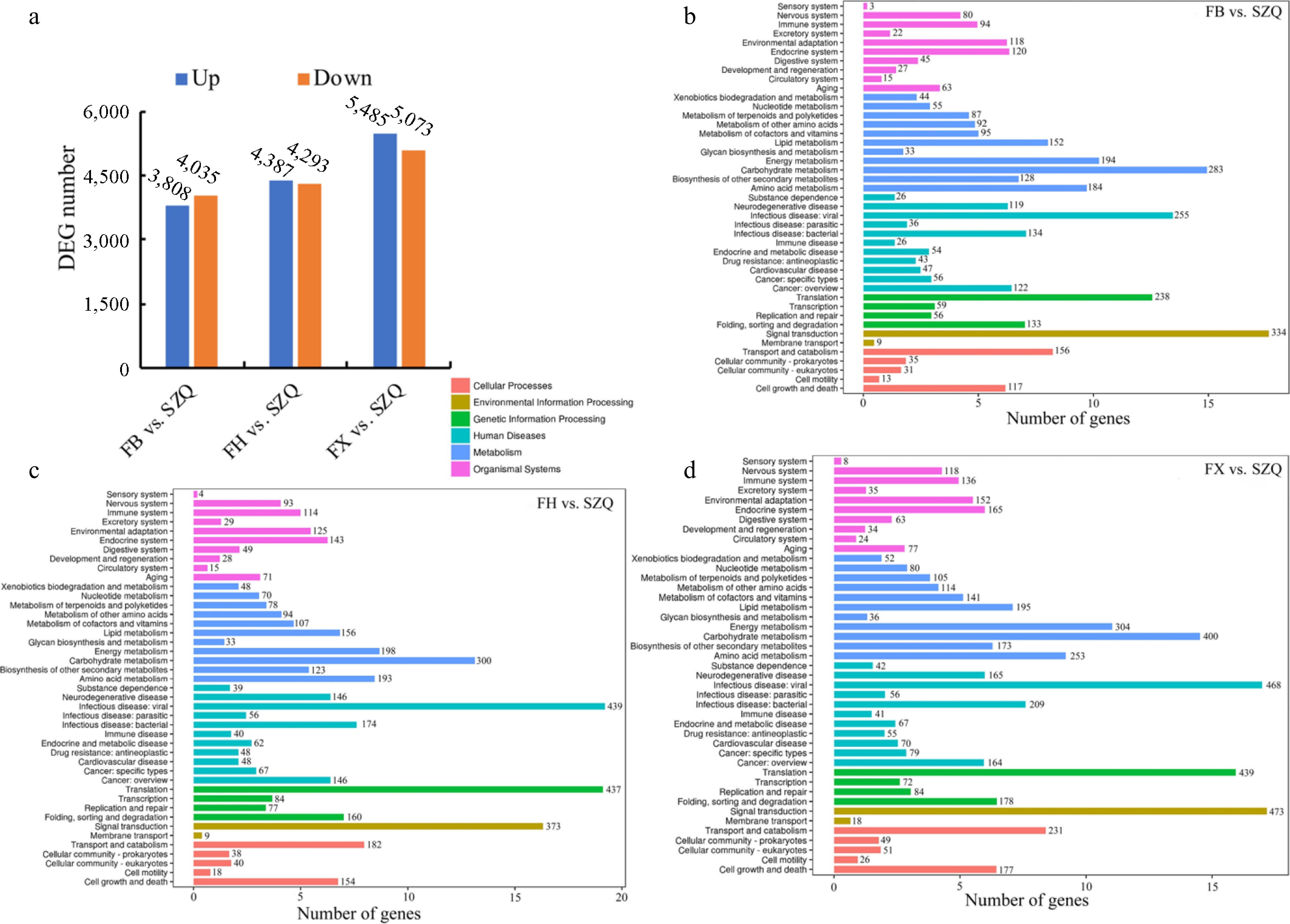 (a) The number of up-regulated (blue), and down-regulated (orange) DEGs (adjusted p < 0.05 and |log 2FC| > 1) for the three indicated comparisons. (b) KEGG enrichment analysis of DEGs in FB vs. SZQ. (c) KEGG enrichment analysis of DEGs in FH vs. SZQ. (d) KEGG enrichment analysis of DEGs in FX vs. SZQ. The X-axis of B, C, and D represent the number of DEGs.
