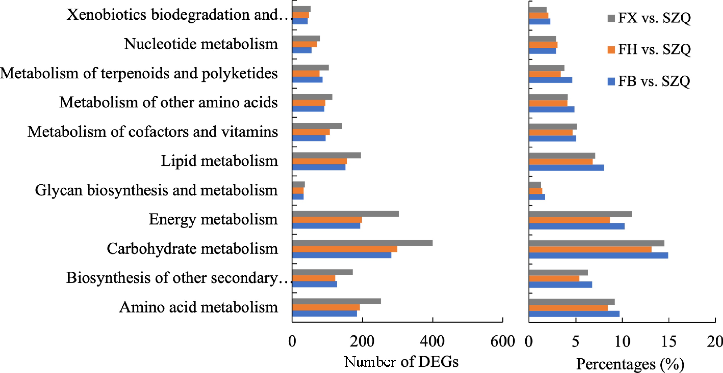 The number of DEGs enriched in major KEGG metabolism pathways for the comparisons of FB vs. SZQ, FH vs. SZQ, and FX vs. SZQ