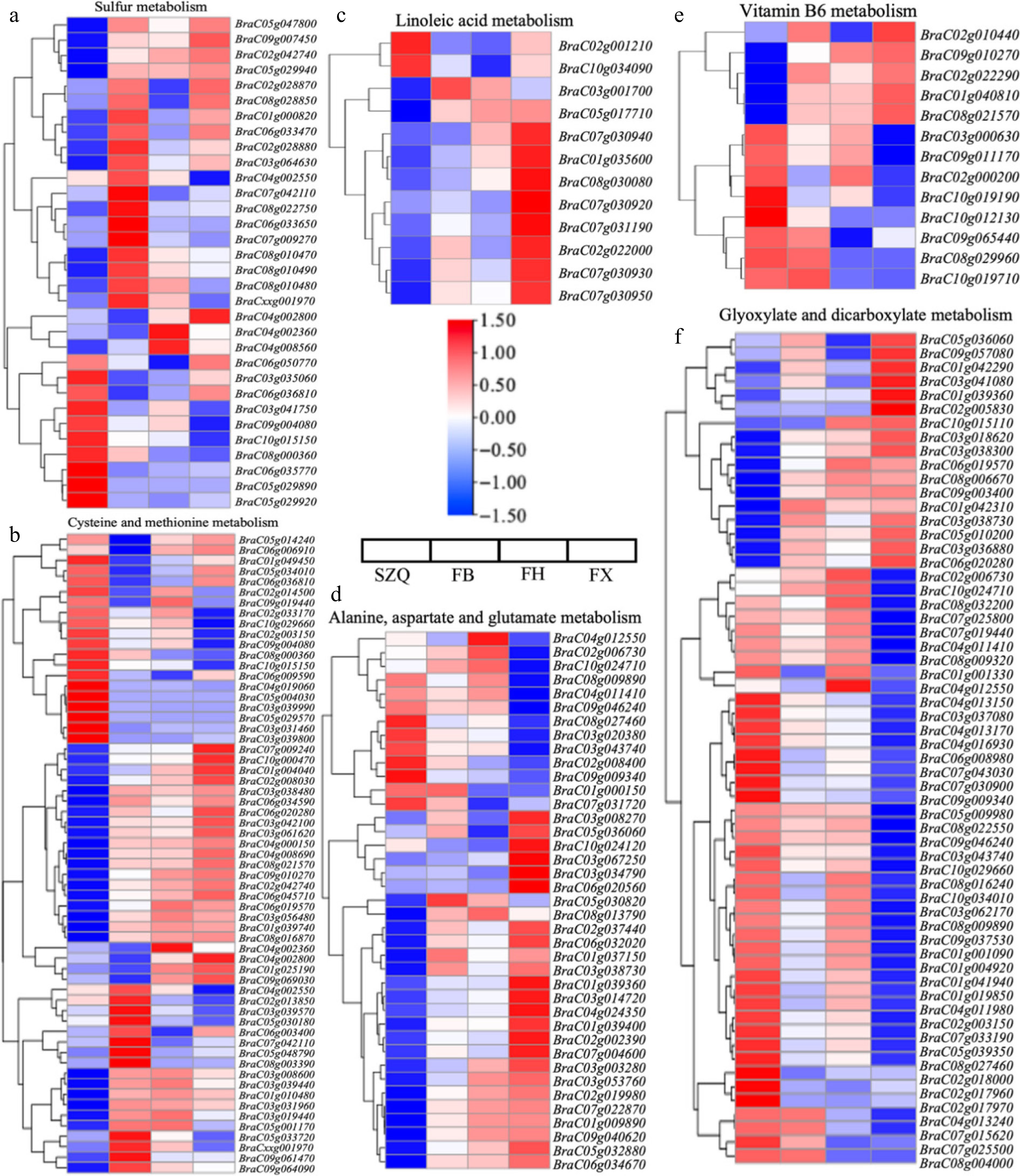 Comparisons KEGG ID Term q-value Enrichment FB vs. SZQ ko00920 Sulfur metabolism 1.09E-04 2.25 ko00270 Cysteine and methionine metabolism 5.02E-03 1.58 FX vs. SZQ ko00591 Linoleic acid metabolism 6.03E-03 2.32 ko00250 Alanine, aspartate and glutamate metabolism 3.47E-02 1.49 ko00750 Vitamin B6 metabolism 3.21E-02 1.99 ko00630 Glyoxylate and dicarboxylate metabolism 1.30E-03 1.55 Comparative analysis with SZQ revealed 13 upregulated and 12 downregulated DEGs shared among FB, FH, and FX. The upregulated genes were primarily clustered in the first three branches of the phylogenetic tree, whereas the downregulated genes were concentrated in the fourth branch. Notably, BraC03g035060 and BraC06g036810 were significantly downregulated across all three cultivars. Additionally, BraC04g002800 and BraC04g002360 showed exclusive downregulated in FB ( Fig. 8a).